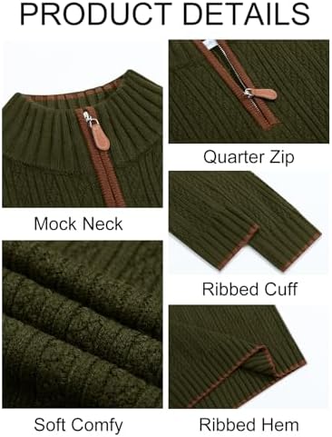 Features: Classic-fit quarter-zip knit sweater, mock neck, basic designed, the hem and placket feature contrasting color designs, fall spring and winter warm polo sweater. Various vintage colors, lightweight and modern basic designed pullover sweaters. Material: The pullover sweater is made from a high-quality thermal ribbed knitwear fabric, good capability of tenderness, stretchy, skin-friendly, no pilling, soft and lightweight fabric creates a relaxed fit. Perfect for keeping you warm during the winter months. Match:You can wear this mens full zip up cardigan sweater alone as a outwear and match it with stylish jeans for the fashion look; or you can match this cardigan sweater with shirts or t-shirts for the daily look. They are versatile menswear items to add to your wardrobes. Occasion: Ideal for both formal events like work and ceremonies, as well as casual gatherings and outings, offering great flexibility in your wardrobe with options in multiple colors. GARMENT CARE&ATTENTION: Hand wash or machine wash, do not bleach. If you have any questions, please contact us in time and we will give you a satisfactory solution.