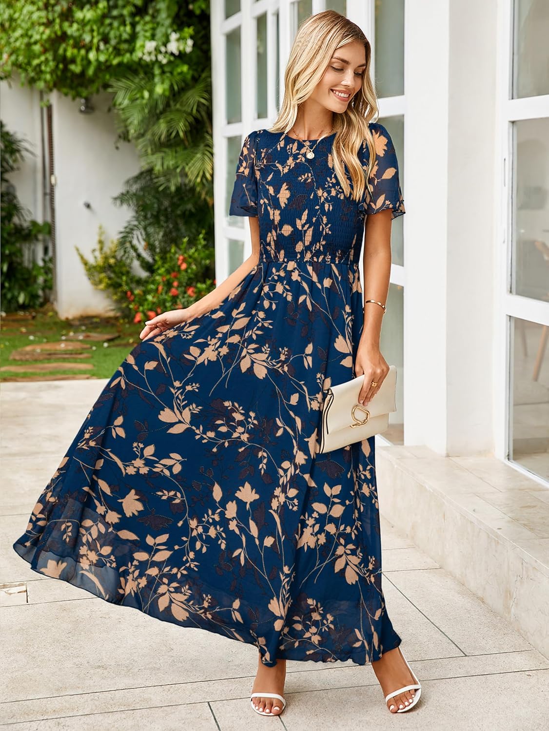 Simplee Womens Summer Floral Summer Maxi Dresses Boho Flowy Flutter Short Sleeve Crew Neck Vacation Smocked Chiffon Dress