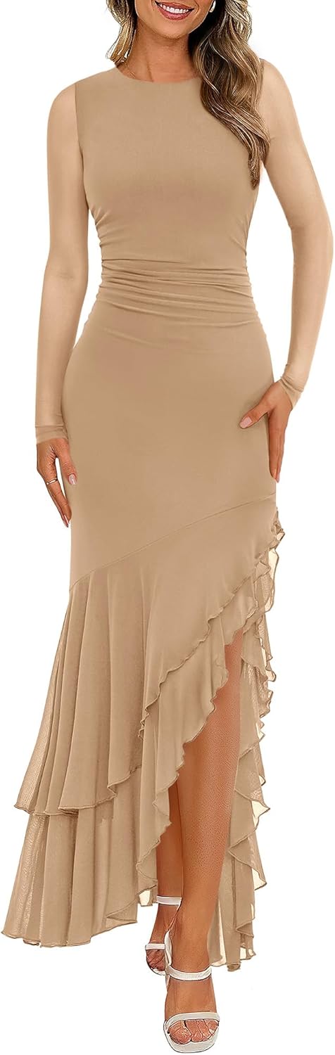 Trendy Design - Ruched Element At Waist And Tiered Ruffles Maxi Skirt Make The Formal Dress for Women Look Trendy And Elegant. Split At Side Combines With Solid Color Make The Bodycon Dress More Delicate and Stylish