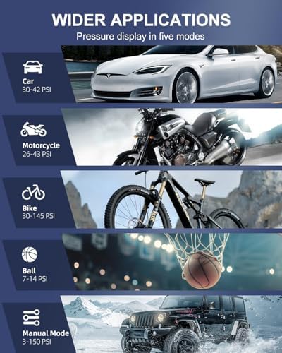 [More selection modes] - 4 preset modes of portable air compressor make it easier to inflate cars, motos, bikes and balls. And the 0-150PSI Custom mode meets more inflation needs. What's more, 4 pressure units can be switched at will, a digital pressure gauge allows real-time pressure and preset values to be clearly seen everywhere, and the auto-off function when the preset value is reached. Easier operation! [Safe & Portable] Its cordless design offers maximum portability, allowing you to use it anywhere without being tethered to a power source.Compact enough to store in your vehicle yet powerful enough to handle various inflation needs, this tire inflator combines convenience with functionality. Perfect for both emergency situations and regular maintenance, it's an essential tool for any vehicle owner.We no longer have to wait in line at a paid air pump several miles away. [Multipurpose Emergency tool] - This cordless tire inflator can be an multifunctional emergency tool. The multi-function LED light can help you solve vehicle failures, alert pedestrians or send distress signals. It is also an emergency power source for electronic devices. ToobTiill is ready for your road trips and emergencies anytime, anywhere. 【??????? ????????】Includes various accessories: tire inflator *1, connecting air hose *1, atmospheric nozzle *1, small-diameter mouthpiece *1, French adapter *1, ball pin *1, Type-C charging cable *1, user's manual *1. [Buy with confidence] - The car tire pump is a perfect gift for your loved ones. Enjoy a risk-free purchase with a 30-day free return or exchange policy. If you have any questions or concerns, please feel free to contact ToobTiill .