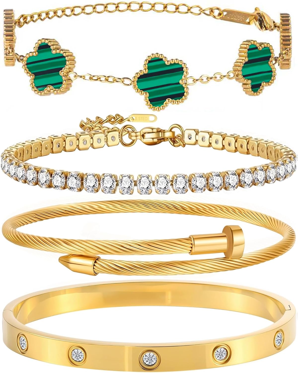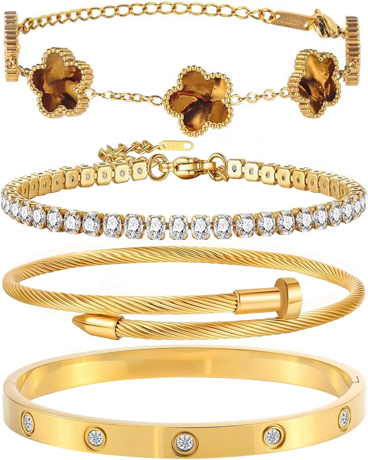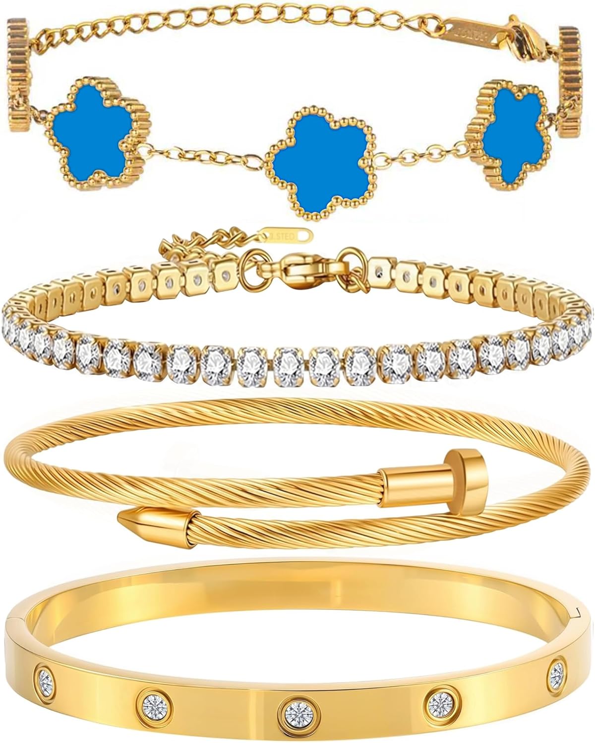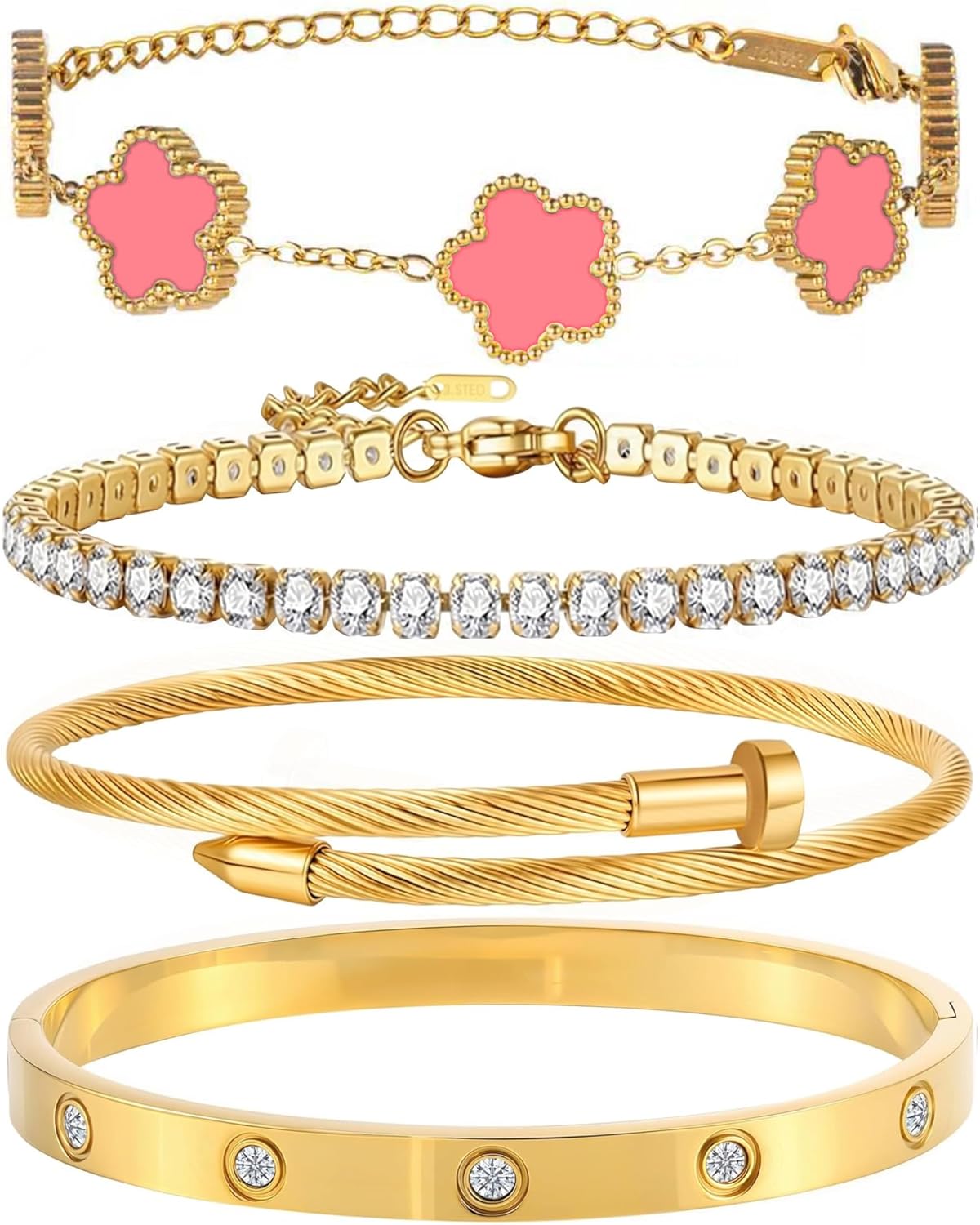 GIVCHO 18K Gold Plated Bangle Bracelet Set for Women Stackable Lucky Floral Adjustable Tennis Bracelet Non Tarnish Gift Jewelry for Christmas Valentines Birthday Mother's Day