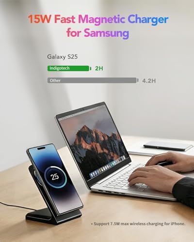 ? Ultra-Strong N52 Magnets – Rock-Solid Snap Every Time: Features powerful N52-grade magnets that deliver a confident “snap” and perfect alignment instantly, holds your phone extremely stable. For the best results and the strongest magnetic pull, we recommend iPhone users use official MagSafe cases or bare phones. Samsung and Google must use magnetic case. Fully compatible with iPhone 17–12 series (except 16e), Samsung S26/S25/S24/S23/S22/S21, and Google Pixel 10/9/8/7/6. ? Triple-Layer Safety + Smart Temperature Control: FCC and CE Certified, built-in temperature monitoring chip automatically lowers charging power if it gets too warm, protecting your battery health. Intelligent trickle-charge mode kicks in once battery reaches 80% — no overcharging, no overheating, no long-term battery damage. Keeps your iPhone and charger cool to the touch even after overnight charging. Real users confirm: “cool and safe all night.” Sleep peacefully knowing your phone is always safe. ? Just Like Original MagSafe Fast Charging: Achieves full official 15W MagSafe speed only when paired with a 20W+ PD adapter (adapter not included in the kit). Using old 5V/1A or USB-A chargers will significantly slow charging. Expect a full charge in about 2 hours with the right adapter — fast, reliable, and exactly as promised. ? Sleep-Friendly LED That Truly Disappears: The soft LED ring shows charging status (green = ready, blue = charging) then automatically turns off completely after just 5 seconds — never too bright, never disturbs your sleep. Perfect nightstand companion. ? Stable Stand for Every Scenario: Flip instantly between portrait and landscape modes. Face ID works perfectly while charging. The non-slip base + strong N52 magnets keep your phone perfectly steady for Netflix binges, Zoom calls, TikTok scrolling, or StandBy mode at your desk — no wobbling, no tipping over even during active use. ? Universal Compatibility Design: Works flawlessly with all build-in MagSafe iPhones (iPhone 17–12 series, except 16e), Samsung Galaxy S phones with MagSafe case (Samsung Galaxy S26/S25/S24/S23/S22/S21 series) and Goole Pixel phones with MagSafe cases (Google Pixel 10/9/8/7/6 series). ? Everything Included + Lifetime Support: Comes with MagSafe charger stand, premium USB-C to USB-C cable, clear user manual, and 24/7 friendly customer service. At Indigotech, safety and real-life performance come first — if anything isn’t perfect, we make it right instantly.