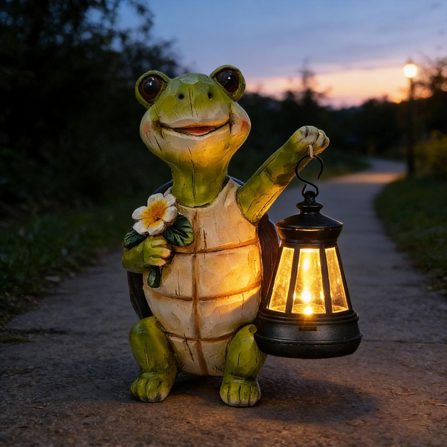Turtles have cute appearances, holding a flower in their arms and carrying a small lantern, adding fun to your garden