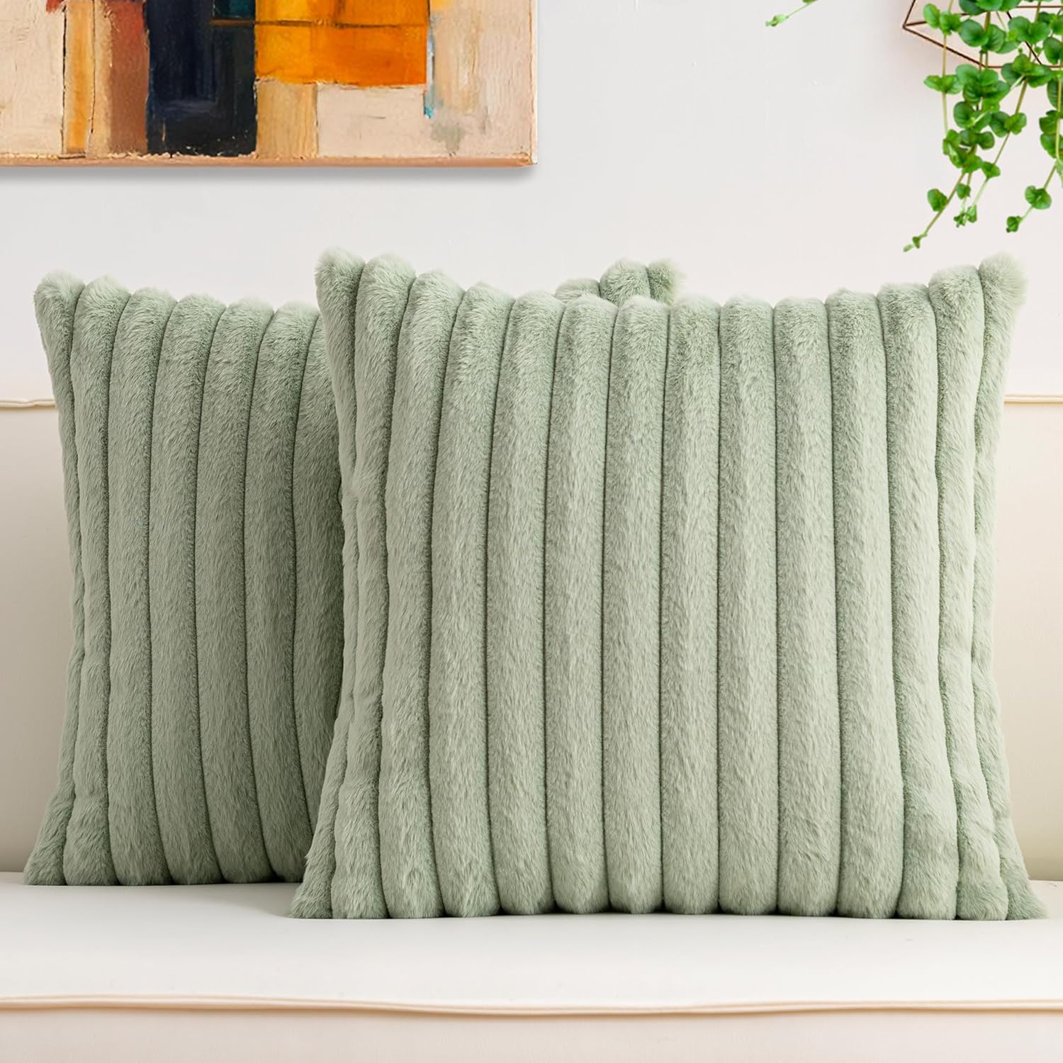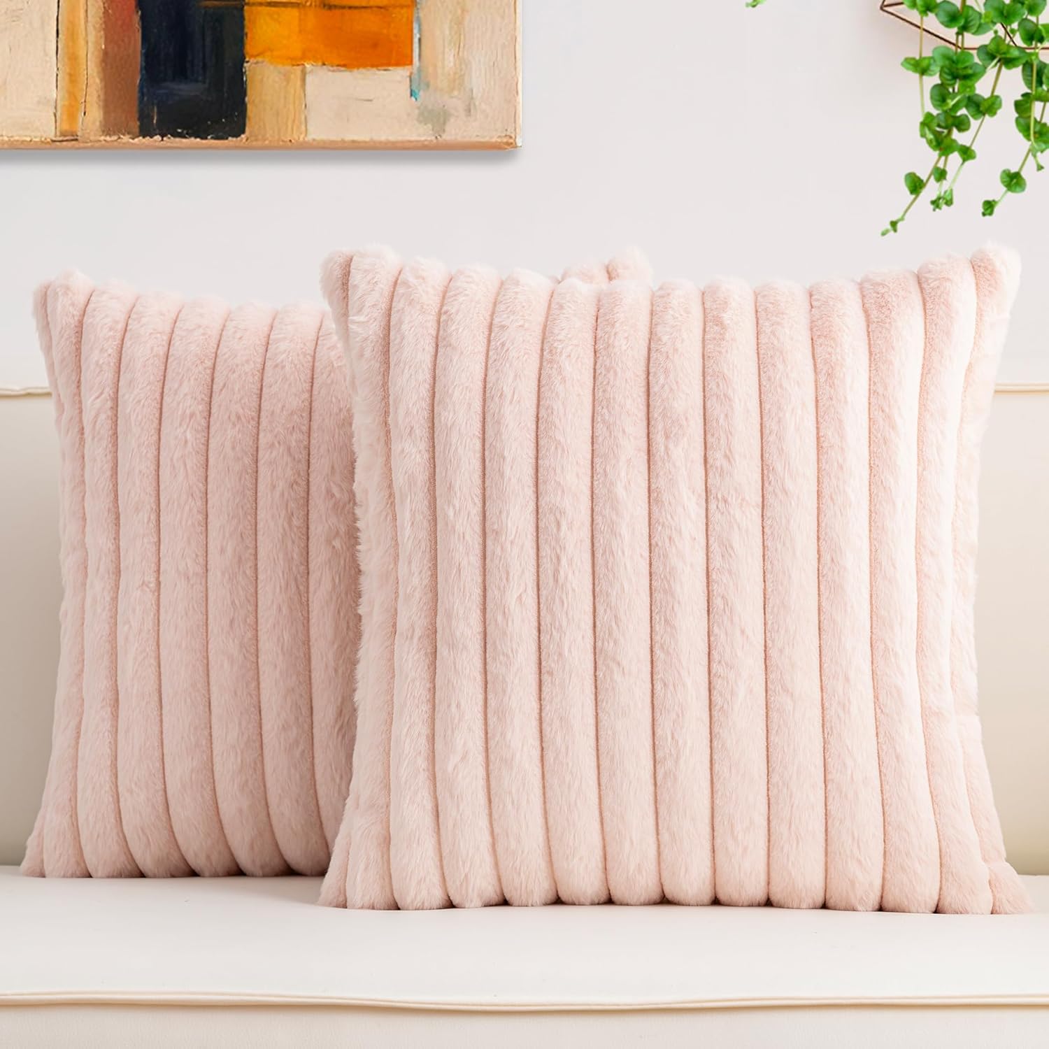 Aegero Pack of 2 Faux Fur Christmas Throw Pillow Covers 18x18 Inch, Soft Plush Striped Neutral Couch Pillow Cover, with Velvet Back Modern Home Decor for Sofa Living Room Couch Bed Cream White