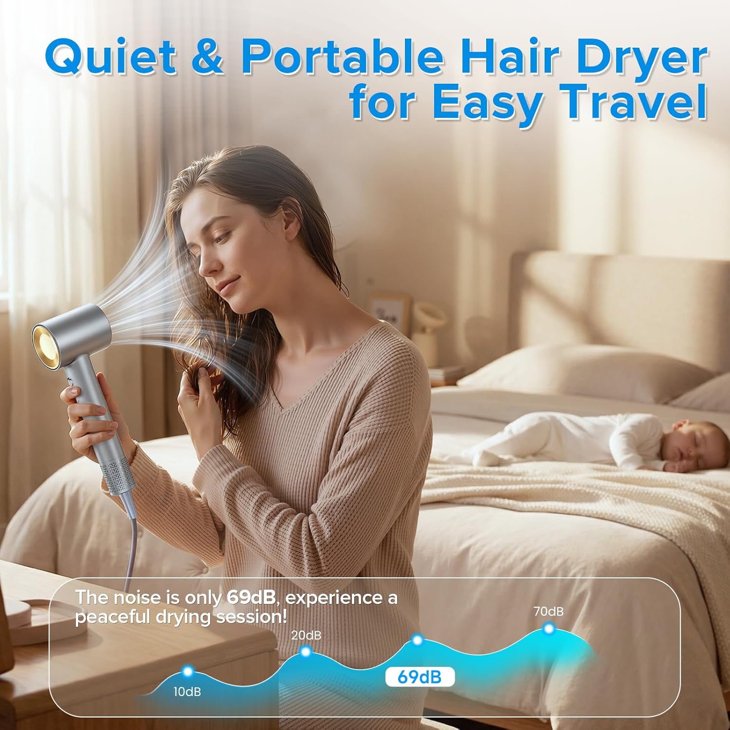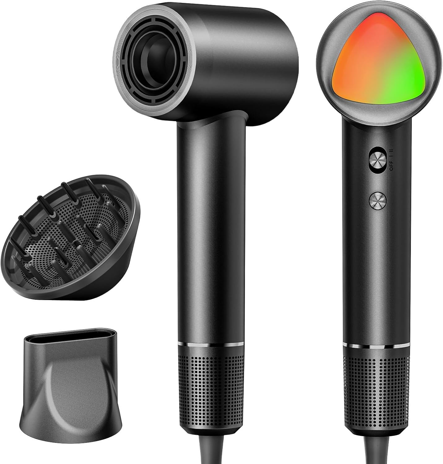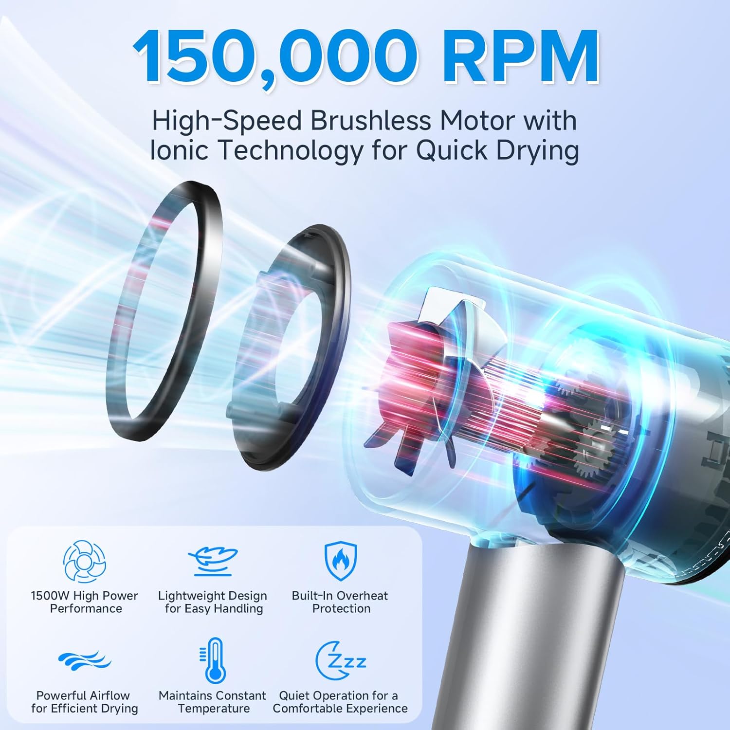 Hair Dryer, 150,000 RPM Brushless Motor, Ultra-Fast Drying with 3 Heat Settings & LED Lights, High-Speed Ionic Blow Dryer, Low Noise Lightweight with Diffuser & Nozzle for Home, Salon, Travel