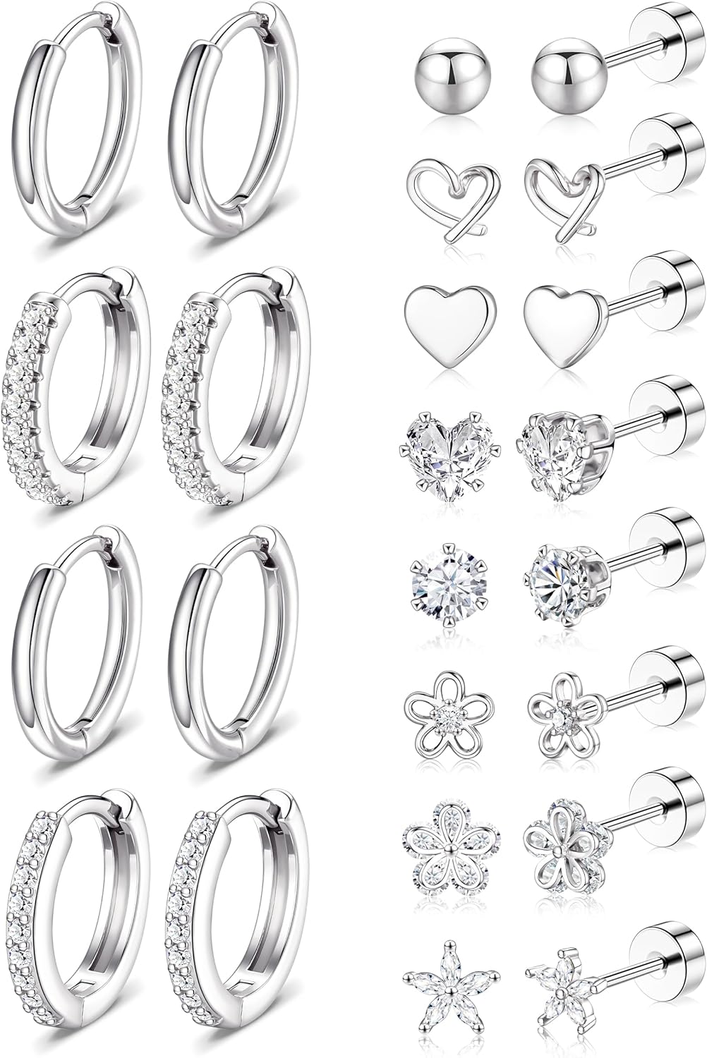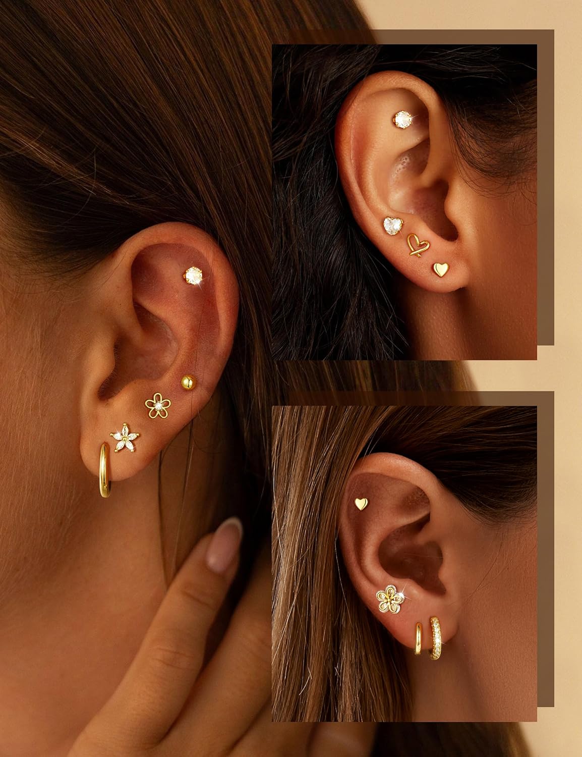 Versatile Set of Gold Stud and Hoop Earrings:This luxurious set includes multiple pairs of Gold Earrings, featuring timeless Stud Earrings and elegant Hoop Earrings. Perfect for creating stacked looks, these 14k Gold Plated earrings are designed for various piercings like cartilage, helix, and lobe, offering endless styling possibilities.