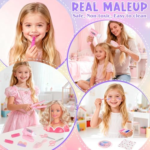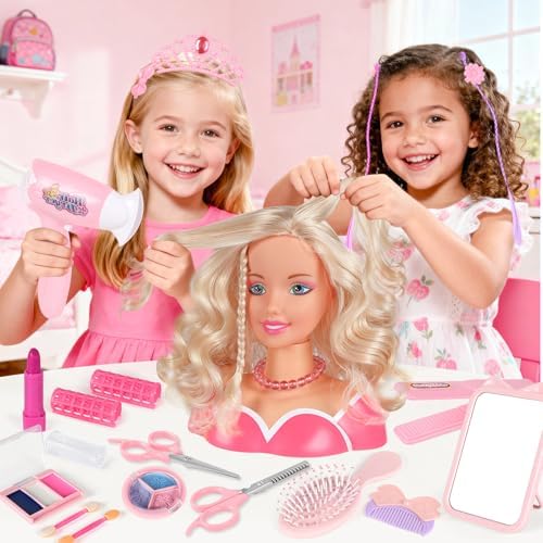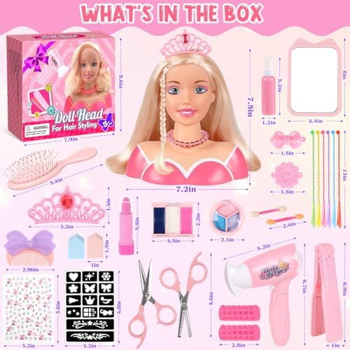 KUBUSFLY 44Pcs Hair Styling Doll Head Toys for Girls, Kids Makeup Hair Salon Pretend Play Styling Kit with Hairdryer, Straightener, Beauty Hair Toy Christmas Birthday Gift for Toddler Girls 3 4 5 6+