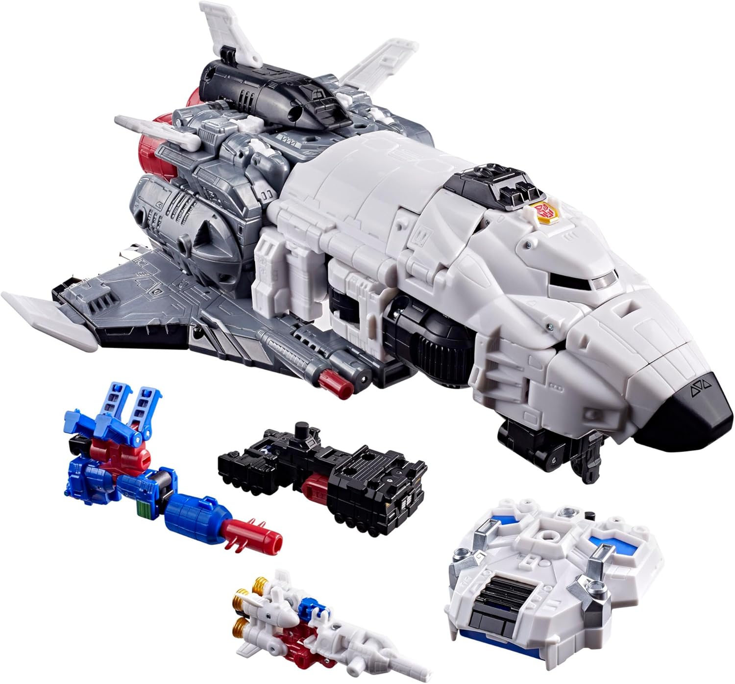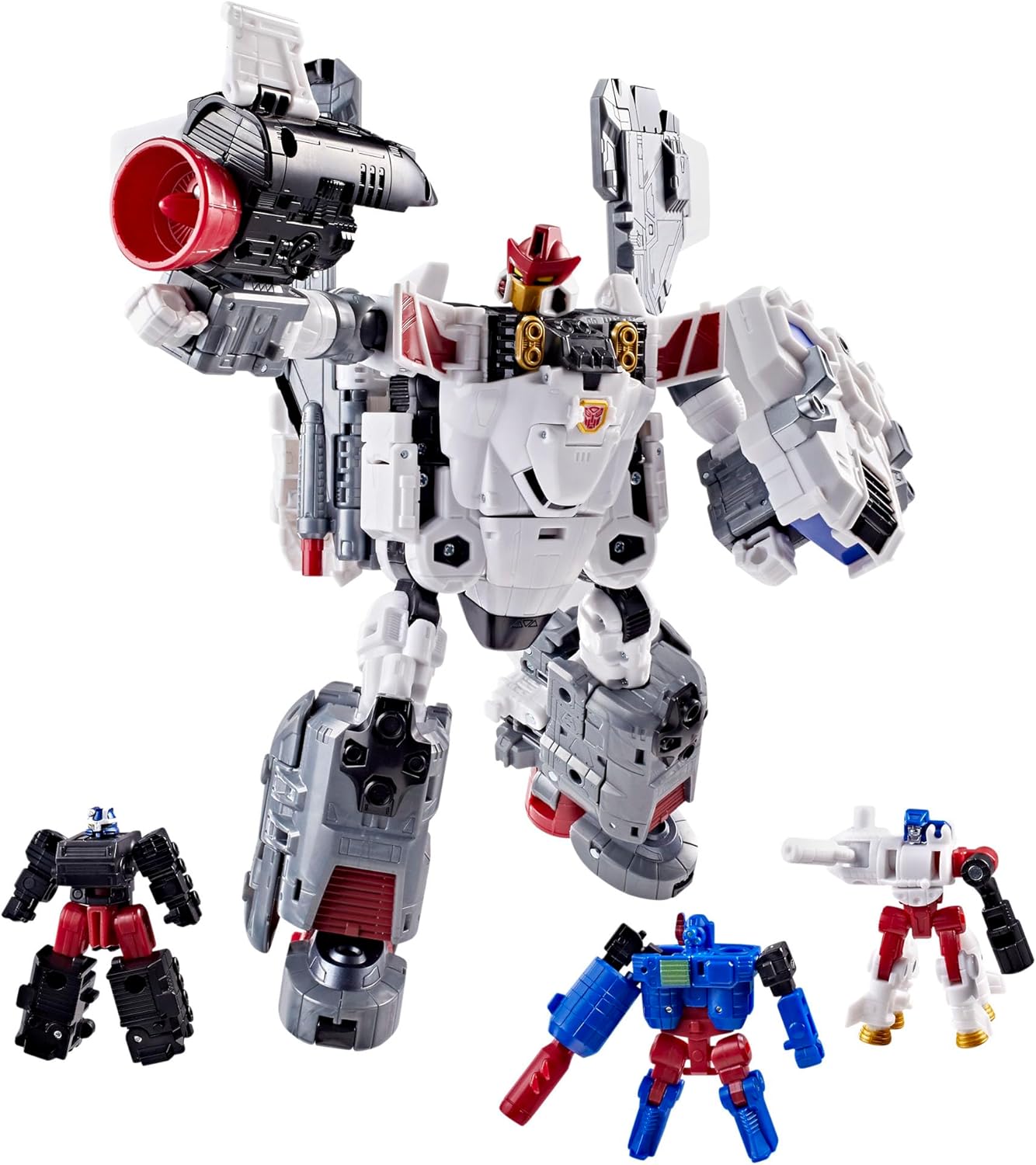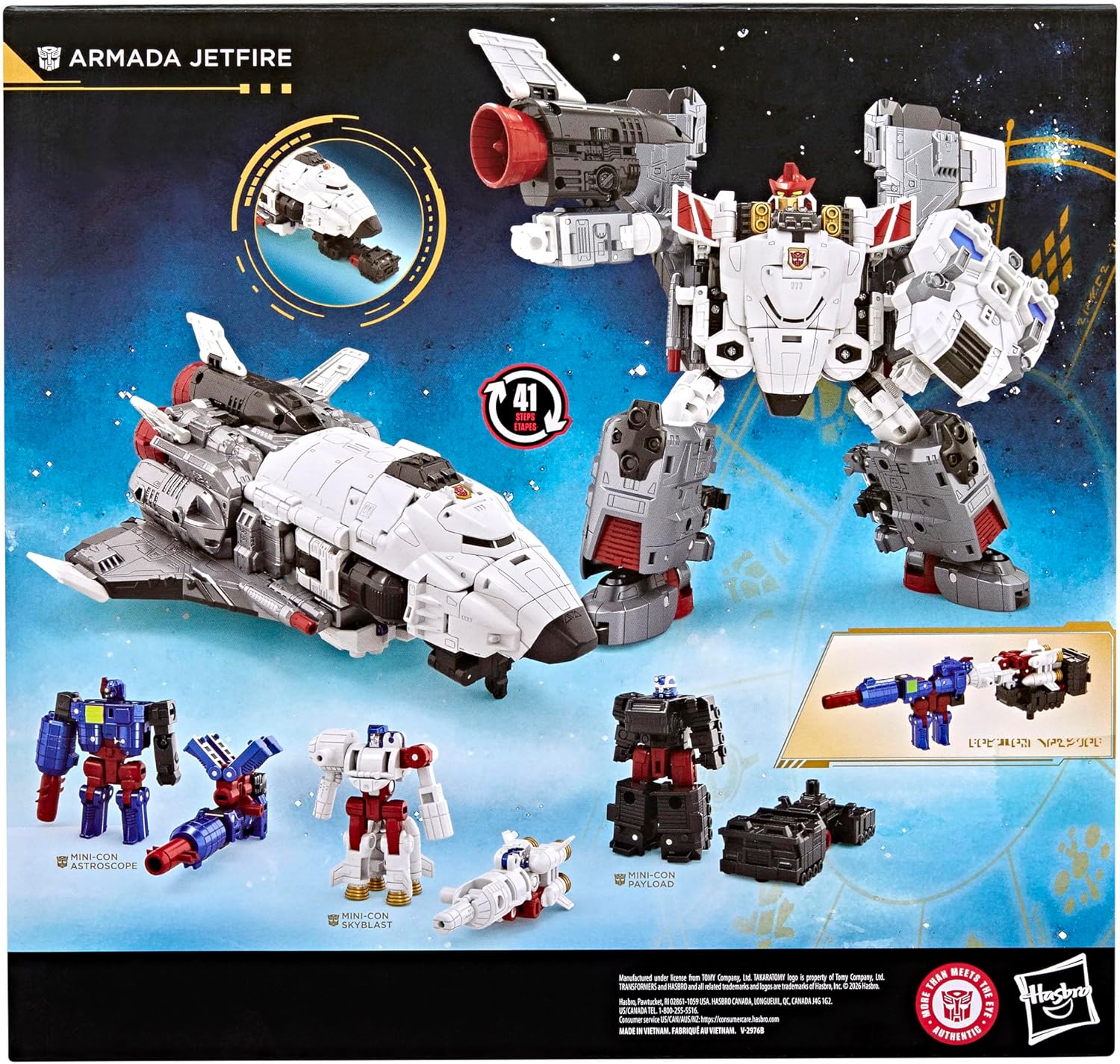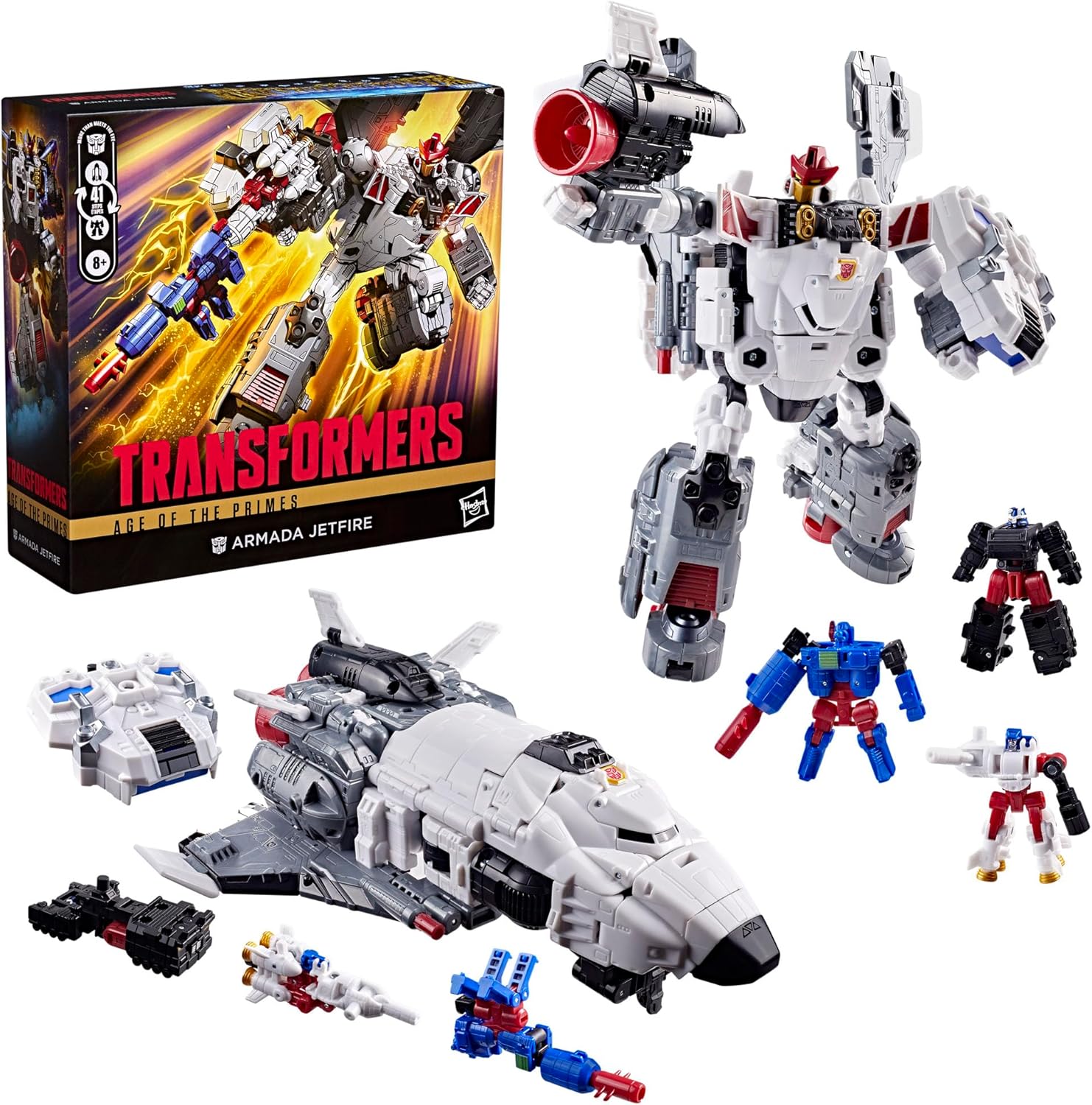 Experience the epic universe of Transformers robots with the Age of the Primes Armada Jetfire figure set! The 8-inch (20 cm) Commander Class figure converts from robot action figure to space shuttle mode in 41 steps and can be combined with the Armada Optimus Prime figure (sold separately, subject to availability) to make Jet Optimus. Figure set includes 3 Mini-Con figures: Mini-Con Astroscope, Mini-Con Skyblast, and Mini-Con Payload, which can be combined to make the Requiem Blaster. With intricate poseability and attachable blaster accessory, this Transformers action figure set makes an awesome addition to any collection. Look for more Age of the Primes Transformers collectible toys (sold separately, subject to availability) to create a lineup that is - More Than Meets the Eye. TRANSFORMERS and HASBRO and all related trademarks and logos are trademarks of Hasbro, Inc.