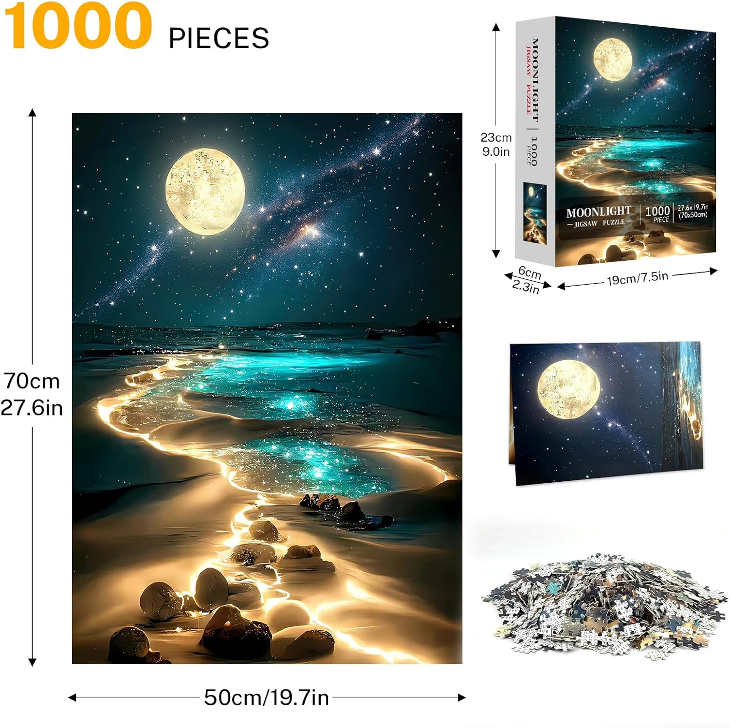 Adult Puzzles 1000 Pieces: Our Moonlight Jigsaw Puzzles for Adults feature 1000 white puzzle pieces, packaged in an exquisite color box with reference poster. The completed 1000 piece puzzle for adults measures 27.6×19.7 in/70×50 cm, making it a perfect size for framing and display as wall decor.