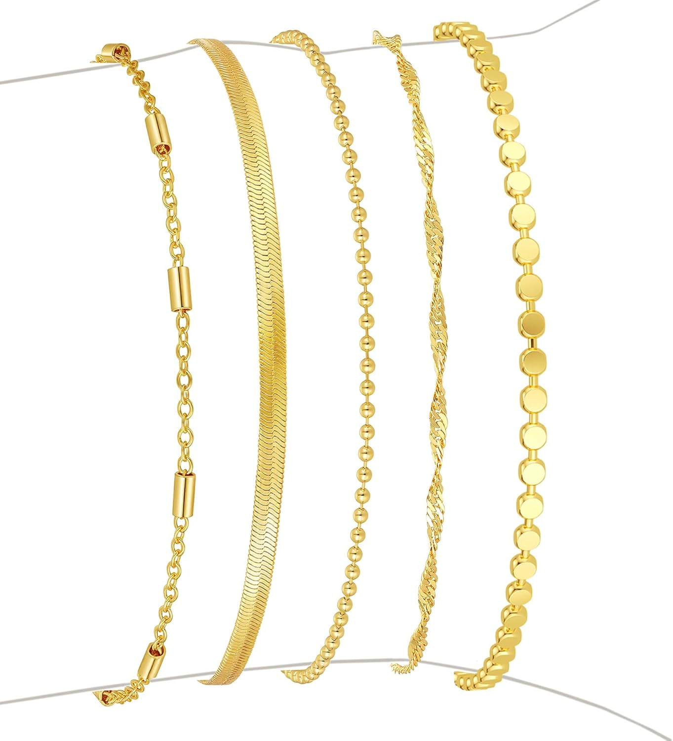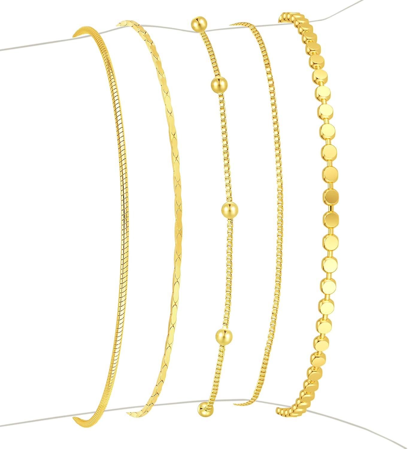 14K Gold Plated 5-Piece Bracelets Collection: Comprises Small Disc Chain, Satellite Chain, Wave Twisted Rope Chain, Flat Oval Chain, and Gold Bead Box Chain. Each dainty bracelet shines with a luxe, high-polish finish, creating a layered look that’s lightweight yet eye-catching—perfect for everyday wear or special occasions