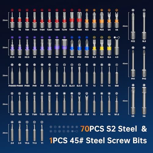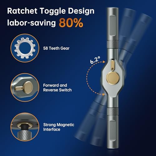 【Magnetic Screwdriver for Effortless Precision】Tired of screws slipping and falling in hard-to-reach places? FIDECO ratcheting screwdriver features an ultra-strong magnetic tip that securely grips screws, preventing drops and frustrations during intricate tasks. Whether you're assembling furniture in your living room or repairing electronics on a ladder, this durable magnetism ensures smooth, one-handed operation—saving you time and hassle. No more searching for lost screws; enjoy a seamless experience from start to finish! 【Versatile 74-in-1 Screwdriver Set】Why clutter your toolbox with multiple tools when one can do it all? FIDECO multifunctional ratchet screwdriver set adapts to any scenario, from quick home fixes to complex automotive repairs. Easily switch between bits and handles to tackle DIY projects, workshop tasks, or emergency maintenance. Imagine having a compact, go-to kit that handles everything—loosening bolts, driving screws, or adjusting appliances—making it your ultimate partner for every job. 【S2 Chrome Molybdenum Steel Bits】Say goodbye to brittle bits that snap under pressure! Our screwdriver bits are crafted from premium S2 alloy steel using CNC milling and continuous heat treatment, ensuring they are hard yet flexible to resist wear and breakage. Perfect for drilling into tough materials like metal or wood, these bits excel in home renovations, professional work, and hobby DIY. From mounting shelves to fixing bicycles, you get reliable performance that stands up to daily demands. 【80% Effort-Saving Ratchet Mechanism】Struggling with stiff screws in tight spaces? The T-handle incorporates a 6.2-degree ratchet angle and 58-tooth reversible mechanism, reducing applied force by 80% for smooth operation in confined areas. Picture yourself effortlessly tightening bolts under a car hood or assembling cabinets in corners—this design maximizes leverage and minimizes fatigue, turning challenging tasks into quick, one-handed achievements. 【Color-Coded Bit】Never waste time searching for the right bit again! Our intuitive color-coded rings let you spot and grab the correct bit in seconds, whether you are in a dimly lit garage or mid-project rush. Ideal for organized DIYers and pros, this feature streamlines your workflow, reduces errors, and keeps your workspace tidy. Enjoy a stress-free experience where every bit is at your fingertips, ready to tackle any repair or creative project. 【Perfect Gift for DIY Enthusiasts】FIDECO magnetic ratchet screwdriver set is a good and practical gift for DIY enthusiast. It is also a great gift for Christmas, birthday, Father's Day or any special occasion!