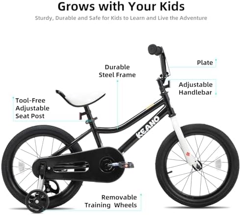 DESIGN FOR KIDS - 1. This Kids bike comes with stable training wheel early rider. 2.Quick release seat simplify the height adjustment. 3.Saddle with holder to learn riding when the training wheel is off. 4.Foot brake suitable for young rider don't have enough power to manipulate the hand brake. MINIMUM MAINTENANCE - Made of premium steel to survive the bumps of learning, the durable steel frame is backed by our limited lifetime warranty. The bike comes with black tire & single speed, only little maintenance needed due to the simple design. DIY DECAL & SAFE CHAIN GURAD - Your child will get a DIY decal, they could make a unique bike with the decal by sticking their name on the frame or chain guard. The chain guard well protects the chain, it will last longer than other bikes, your child will not get hurt when try to touch the chain. EASY TO INSTALL - The children bike comes with 85% Pre-assembled body and the basic assembly tools, only pump needed for tire, normally takes a novice about 20 minutes to assemble it. If you have problem about assembly or the bike, please contact us. RECOMMENDED SIZE CHART - 12" BIKE FOR 2-4 YEARS (33"-41") TODDLER, 14" bike for 3-5 years (35" - 47") child, 16" bike for 4-7 years (41" - 53") boys & girls, 18" bike for 5-9 years (43"-59") boys & girls. Note: child height may vary even at the same age, please take the height into consideration.