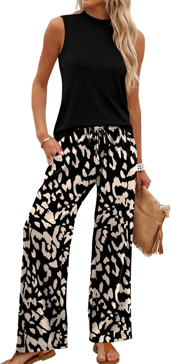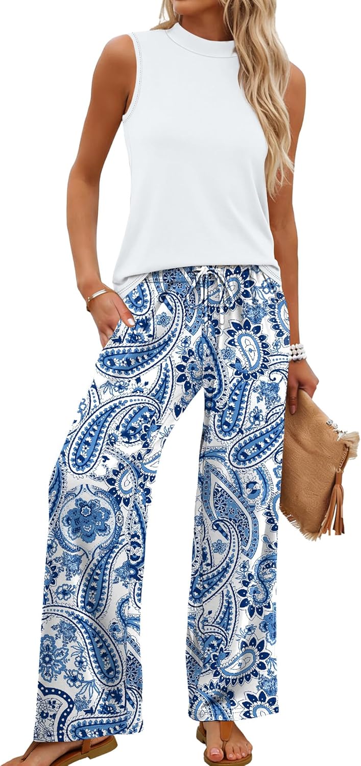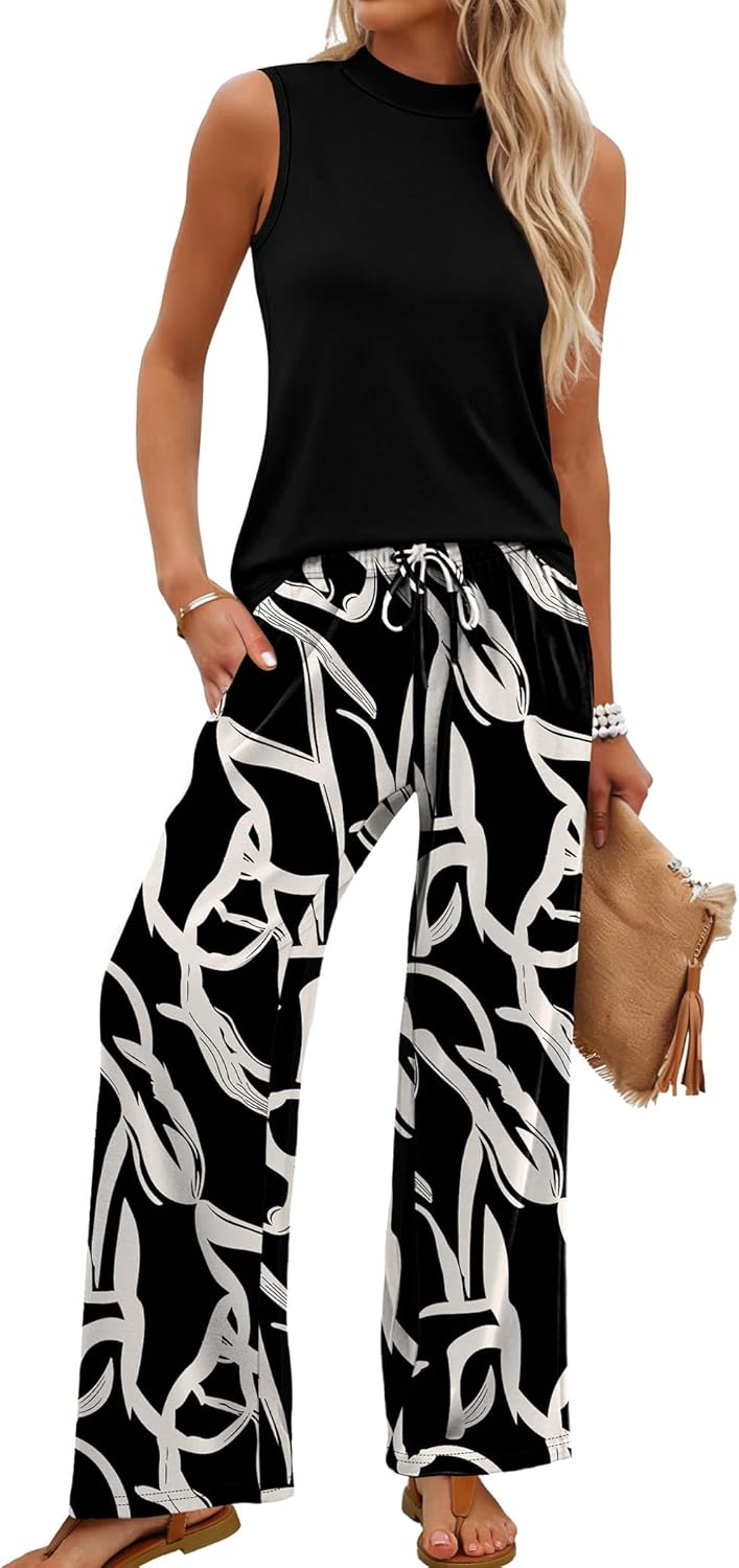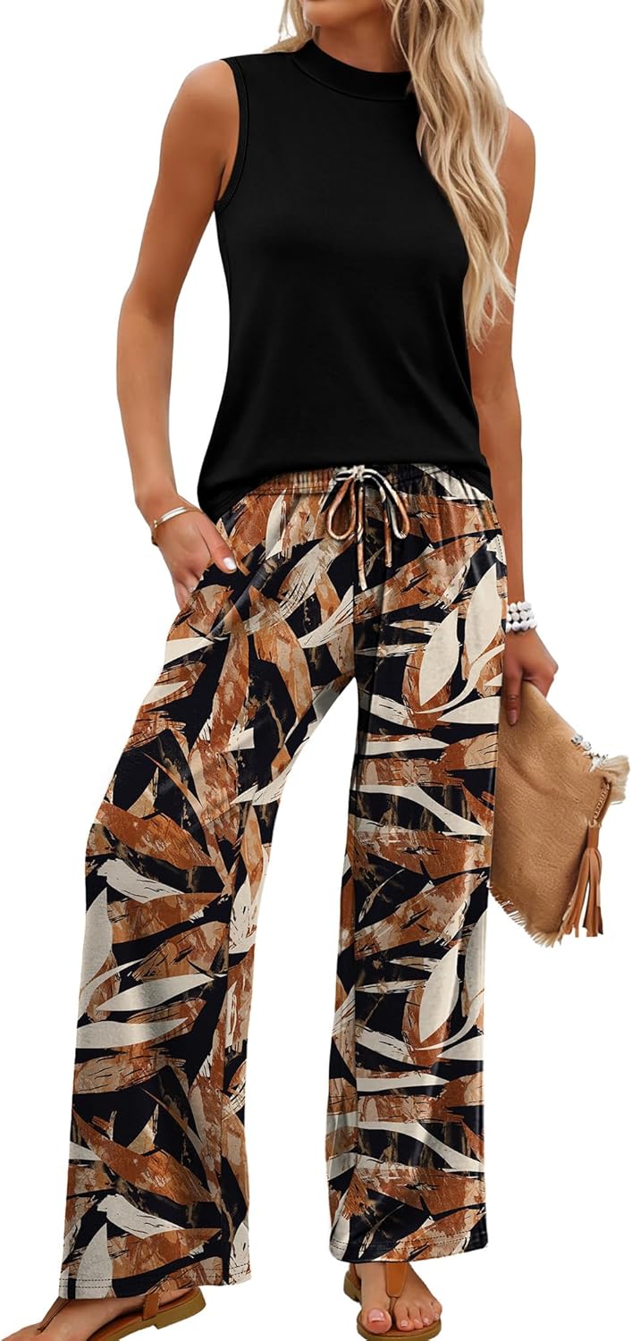 WIHOLL Two Piece Set for Women Summer Spring Outfits Cruise Travel Airport Beach Vacation Mock Neck Wide Leg Pants Set