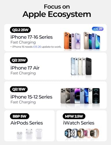[Ultra-Compact Foldable Design] This 3 in 1 charging station's phone charging panel opens up to 65°, bottom earbud pad rotates 180°, and the entire 3-in-1 charger folds down to just 3.94 × 2.44 × 1.23 inches; weighing only 6.35 oz, it easily fits into a backpack, handbag, or carry-on, making it ideal for travel, office desks, and bedside charging setups. [Qi2.2 Ultra-Fast Wireless Charging]This Magnetic Wireless Charger with Qi2.2 Ultra-Fast Wireless Charging – supports up to 25W wireless output for iPhone, fully charging iPhone 17 Pro Max in approximately 1 hour 45 minutes, and reaching 60% in just 30 minutes, ideal for fast charging during busy mornings, work breaks, or short rest periods. [Heat-Isolation Cooling Design] The 3 in 1 Magsafe Charger is equipped with the separated PCBA heat-dissipation plate reduces heat transfer during charging, preventing overheating and maintaining stable performance during overnight charging or long desk use, while helping protect long-term iPhone battery health. [Rock-solid stability]The qi2 25W magsafe charger built-in 1200 g magnetic force keeps your iPhone precisely aligned for efficient Qi2.2 charging, while the silicone anti-slip base prevents movement on desks or nightstands, ensuring stable use in both portrait and landscape orientations. [Power Compatibility Statement] The LISEN 3 in 1 Wireless Charger supports Qi2.2 25W for iPhone 17 Pro / 17 Pro Max / 17, Qi2.2 20W for iPhone 16 / 16 Pro / 15 series, and wireless charging for Apple Watch (all series) and AirPods; designed exclusively for Apple devices and optimized for stable daily charging. [What's in the box]1* Qi2.2 3-in-1 wireless charging station, 1* 45W power adapter, 1* 3.3 ft (1 m) nylon-braided 60W USB-C to USB-C cable, 1*Manual, 24/7 Customer Support
