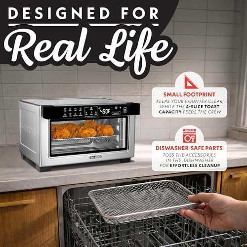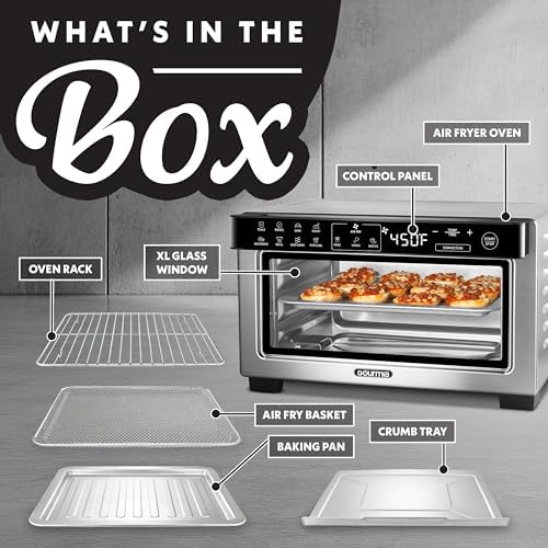 12 Preset Functions – Air fry, bake, roast, toast, bagel, fries, wings, snacks, broil, dehydrate, popcorn and keep warm with a single tap. FryForce 360° Technology – Perfect for healthier cooking, rapid airflow circulates heat for golden, crunchy food using little to no oil. Large Capacity with 3 Rack Positions – Fits a 9” pizza, 4 slices of bread, or stacked batches using adjustable rack levels. Convection Mode — Promotes even heat distribution for quicker, more consistent cooking. Accessories for Every Meal – Includes an air fry basket, oven rack, baking pan, and crumb tray for all cooking, baking, and air-frying needs.