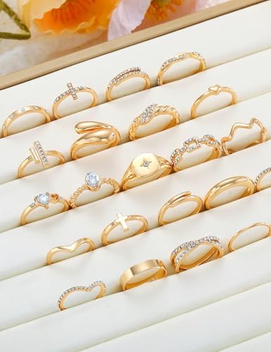 Versatile Styles: This ring set includes 21 exquisite rings in a variety of styles, from delicate and refined to bold and chunky. It incorporates popular elements such as crosses, hearts, twists, openwork designs, and rhinestones, allowing for endless stacking combinations. Wear a fresh and unique stacked look every day, avoiding repetition Comfortable Wear: These rings are crafted from a premium lead-free and nickel-free alloy and treated with a durable gold-plating process. They are hypoallergenic, skin-friendly, and resistant to discoloration and rust. The smooth, polished surface ensures comfortable wear and scratch resistance. The set includes multiple sizes (6 to 9) to fit different fingers Versatile Stacking: The rings are designed to inspire your creative expression. You can wear them individually, stack them on a single finger, or distribute them across multiple fingers and knuckles. With a variety of styles and sizes available, you can easily mix and match to create a personalized and trendy look that showcases your unique fashion sense Thoughtful Gift Option: Timeless gold is suitable for all styles and occasions-from everyday office wear to parties, weddings, and evening events. The exquisite packaging makes this ring set a thoughtful gift for birthdays, Christmas, Mother's Day, anniversaries, or a treat for yourself, sure to delight any woman Customer Support: If you encounter any product quality problems during the receipt or use of the product, the seller support is available to help and will provide you with a solution within 24 hours Complete Ring Collection: Receive 21 individual rings in one comprehensive set, providing you with an extensive collection to match different outfits, moods, and occasions throughout your week