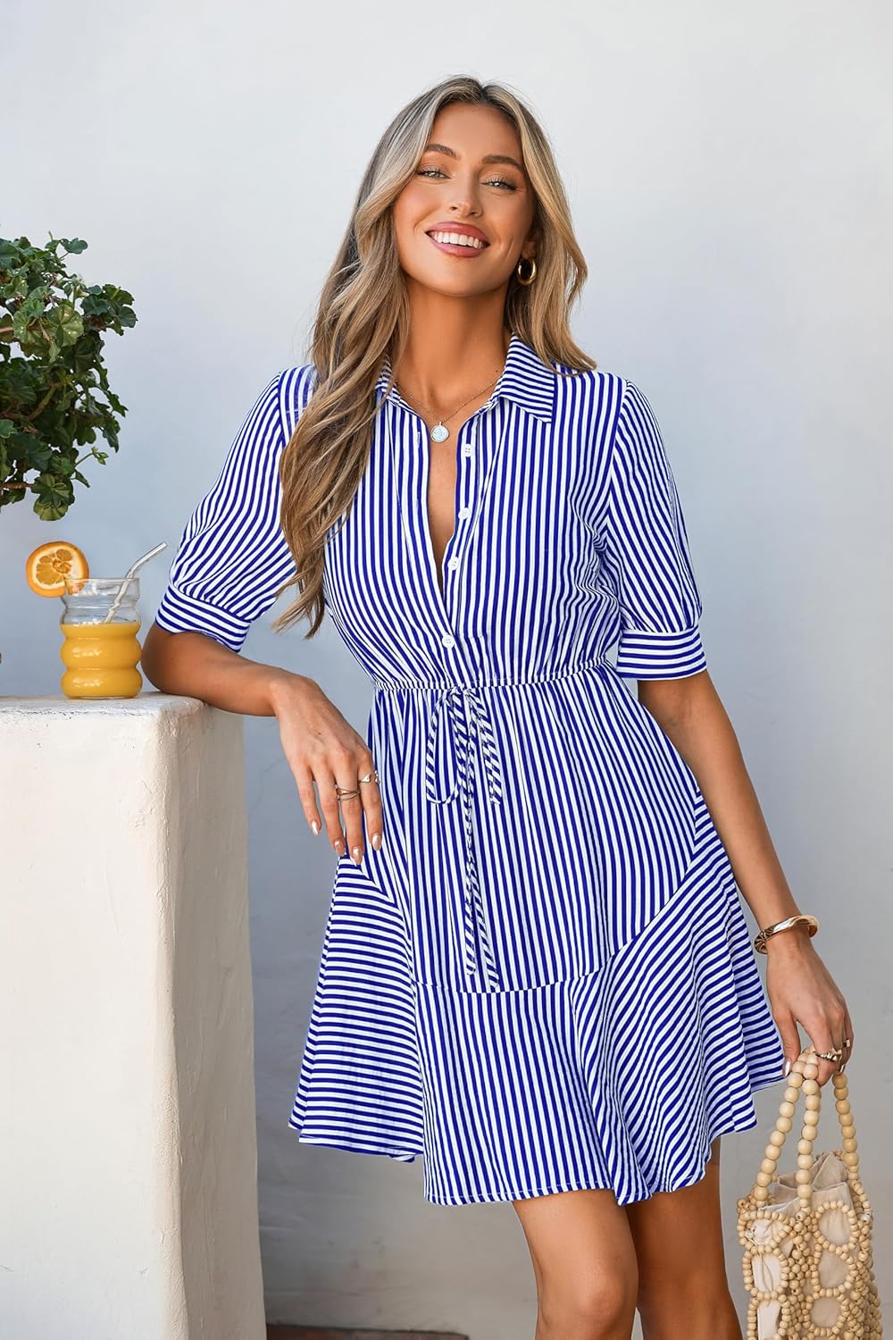 MASCOMODA Womens Puff Short Sleeve Striped Mini Summer Dress Spring Casual V Neck Button Down A Line Short Work Shirt Dresses
