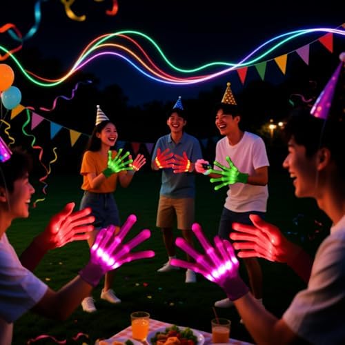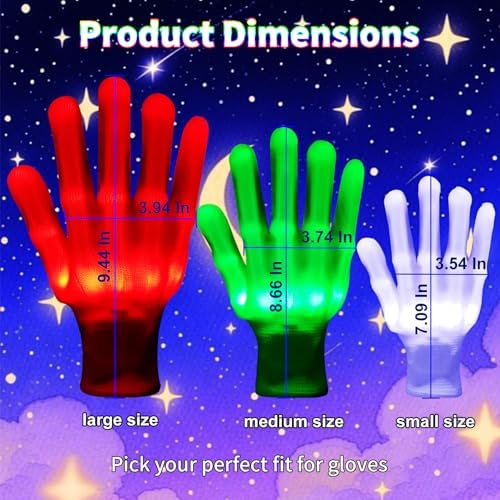 Multi-Scene Use & Size Options for All Ages: Available in multiple sizes to fit kids, teens, and adults, these LED gloves (also called light-up gloves) are perfect for festivals (Halloween, Christmas, Easter) and events (stage shows, birthday parties) — instantly making the wearer the center of attention Multiple Colors, One Click Switching: Multi-color LED light-up gloves with one-click mode control — powered by high-brightness LED beads, all modes can be switched with a single click of the wrist button, making operation effortless for teens and adults alike. A simple wave of your hand creates dreamy light and shadow effects that make these light-up gloves stand out in any setting Soft & Breathable: The light-up gloves are crafted from high-quality nylon and polyester, boasting a soft touch that’s breathable and non-stuffy. They keep hands warm in autumn and winter, while remaining comfortable to wear in spring and summer. With an elastic wrist design, they fit teens’ and adults’ hands perfectly—balancing comfort and stability, non-tight with a sleek, trendy look Ideal Gift: Glowing light-up gloves are perfect for festivals and occasions like Thanksgiving, Christmas, New Year, Easter, and birthdays—a trendy gift for teens and a fun party favor for adults, balancing personality and practicality. They’re also ideal for gifting to friends, treating yourself, or celebrating any occasion Ready-to-Use & Spare Batteries Included: These light-up gloves come pre-installed with 2 CR2016 batteries—pull out the insulation sheet and use right away. They last hours for a full party or show. Bonus 4 spare batteries to keep the fun going. Hidden battery compartment design—easy to replace (no tools needed). Safely sealed circuit—no leakage risk, safe for everyone