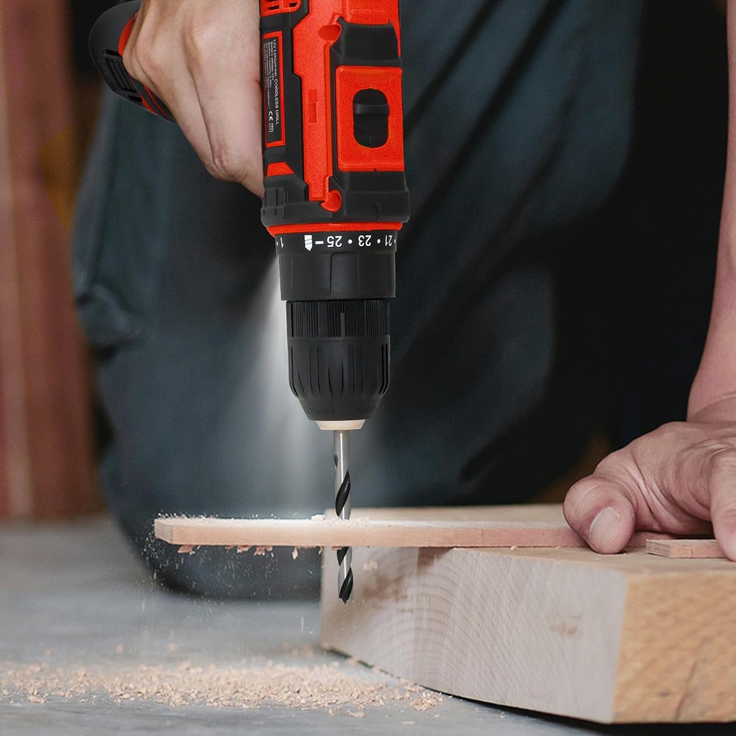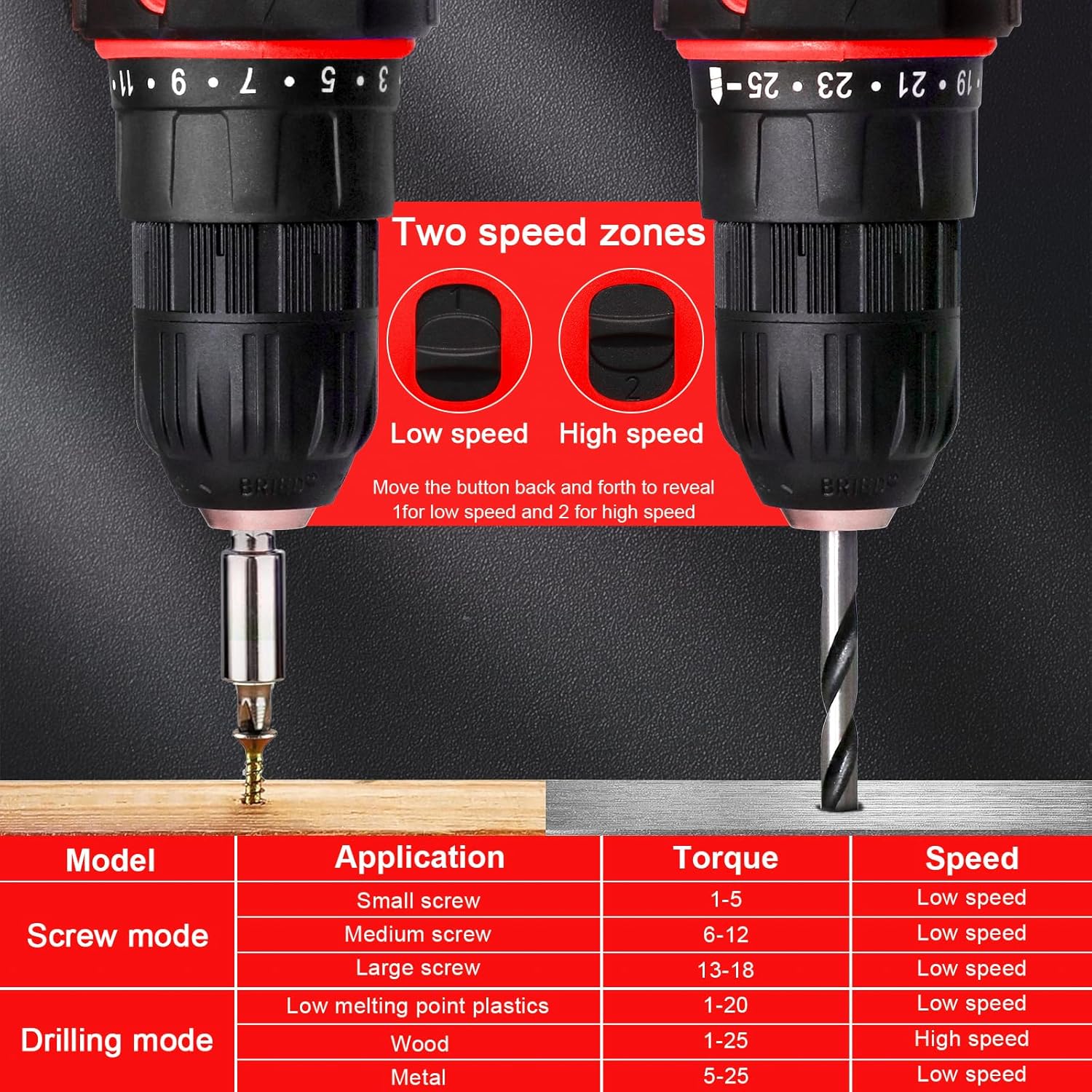 • ⚙️ 【2-Speed Control & 25+1 Torque Settings】 Switch between low speed (0-400 RPM) for precision screwing and high speed (0-1600 RPM) for efficient drilling. The 25+1 torque settings allow you to adjust force according to material hardness—ideal for wood, metal, plastic, and DIY assemblies.