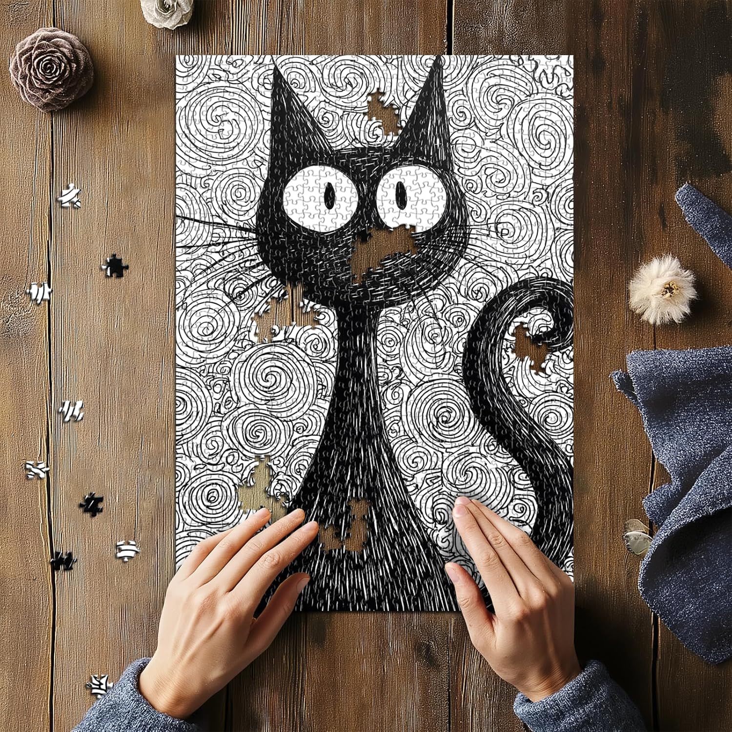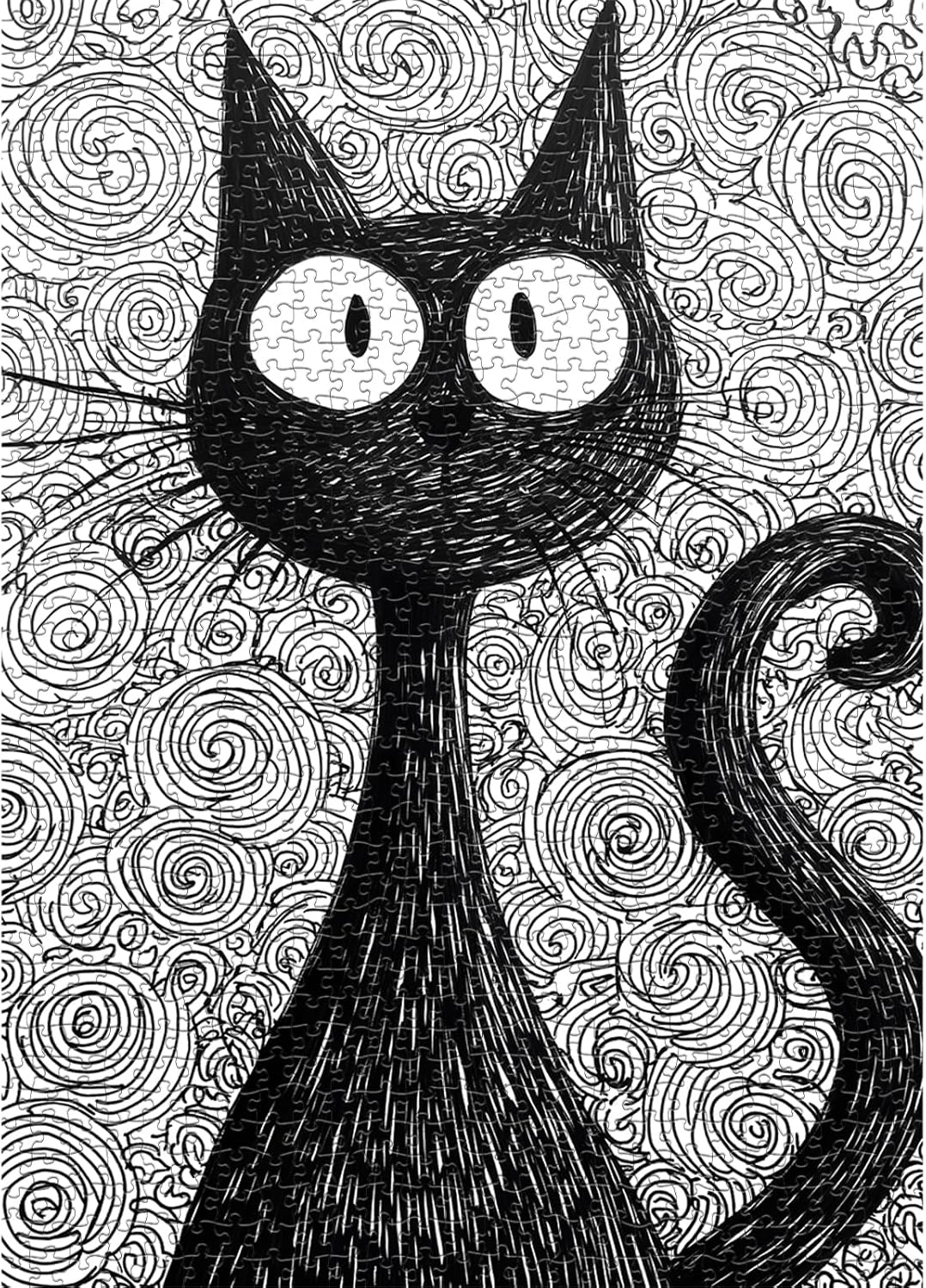 Whimsical Black Cat Artwork:This Black Cat jigsaw puzzle features a playful black cat illustrated in an expressive ink style, surrounded by swirling doodle patterns that create a bold and imaginative artistic design