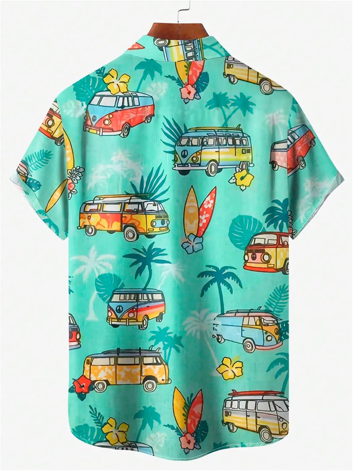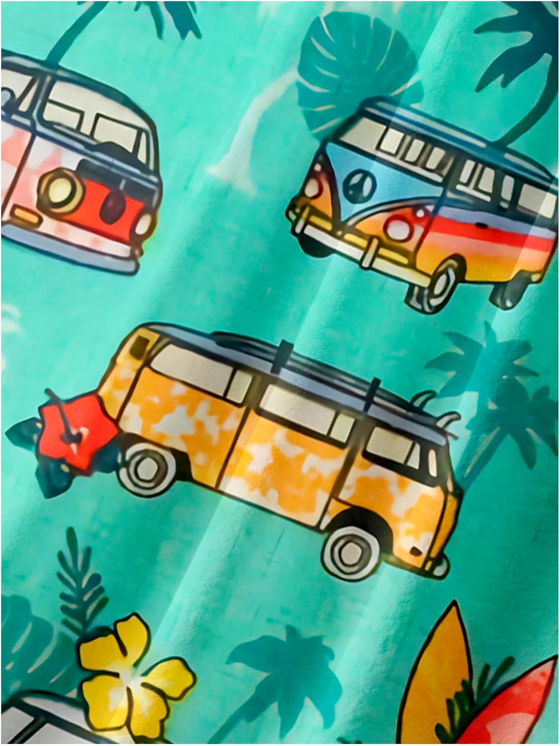 Features: Boho shirt for men features classic collar, short sleeves, bold vacation-inspired print of vintage vans and tropical foliage, and a relaxed fit for a laid-back, playful silhouette