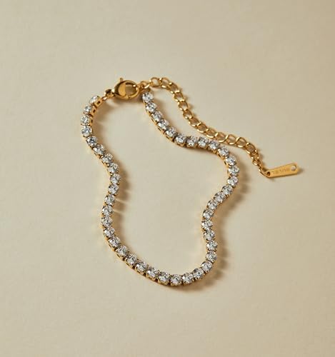 3MM CZ TENNIS BRACELET – Crafted with brilliant AAAAA cubic zirconia stones, this elegant 3mm tennis bracelet delivers timeless sparkle in a refined, feminine design. Lightweight and comfortable for everyday wear, it’s perfect for stacking and layering with your favorite bracelets to create a sophisticated jewelry stack. PREMIUM NON-TARNISH QUALITY – Crafted from durable stainless steel with long-lasting 18K PVD gold plating, this gold tennis bracelet maintains its rich shine without fading or tarnishing. Waterproof, hypoallergenic, and sweat-resistant, it’s designed for everyday wear and safe for sensitive skin. READY-TO-GIFT LUXURY - Elegantly packaged in a signature RUVEL leather pouch with refined gold foil stamping, this 3mm CZ tennis bracelet is ready to impress. A meaningful jewelry gift for your best friend or wife, mom, girlfriend or daughter - perfect for birthdays, anniversaries, Valentine's Day, Mother's Day, and Christmas. A dainty gold tennis bracelet for women designed for everyday elegance and special moments. CUSTOMER COMMITMENT - At RUVEL, quality and customer satisfaction comes first. If you have any question or concerns, our support team is always ready to assist.