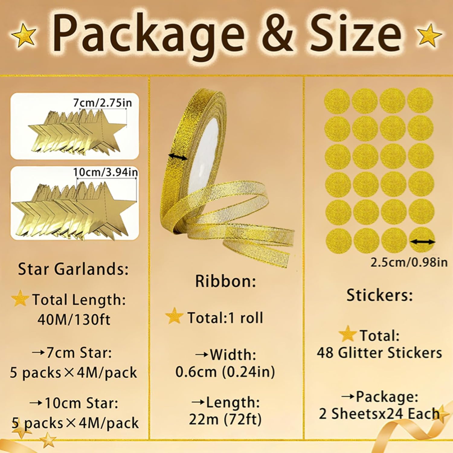 【All-in-one Gold Party Decorations: 130FT Star Garland + Ribbon + Stickers】 Get everything you need for party decor in one pack. This set includes 10 strands of gold star garland (10 x 4m, 40m/130ft total) with two star sizes (7cm & 10cm) for layered depth, perfect as star streamers for any celebration. You'll also receive 22m gold ribbon for easy installation and 2 sheets of round sparkle stickers (48 pks total, 2.5CM each) to enhance your decor. It's ideal for birthday decorations, Christmas decor and wedding party setups with no extra purchases required.