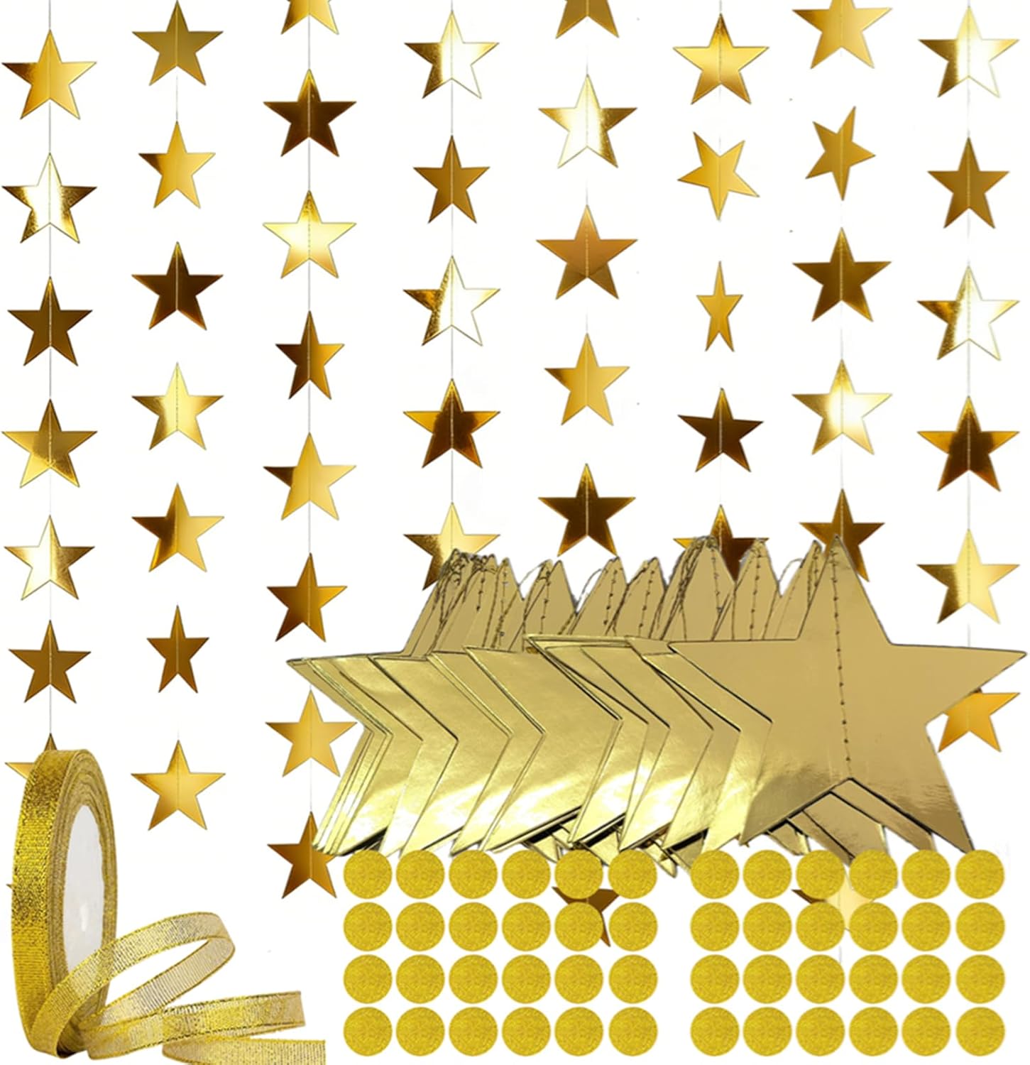 10cm stars, 22m gold ribbon for damage-free installation, and 48pks 2.5CM round sparkle stickers. Crafted from double-sided gold mirror cardstock, it shines brilliantly from every angle, while securely sewn stars prevent falling off. Individually packed to avoid tangles, it’s reusable and easy to store. Perfect for birthdays, Christmas, weddings, graduations, and holiday parties, it doubles as star streamers or statement decor, adding glamorous, cohesive charm to any space.