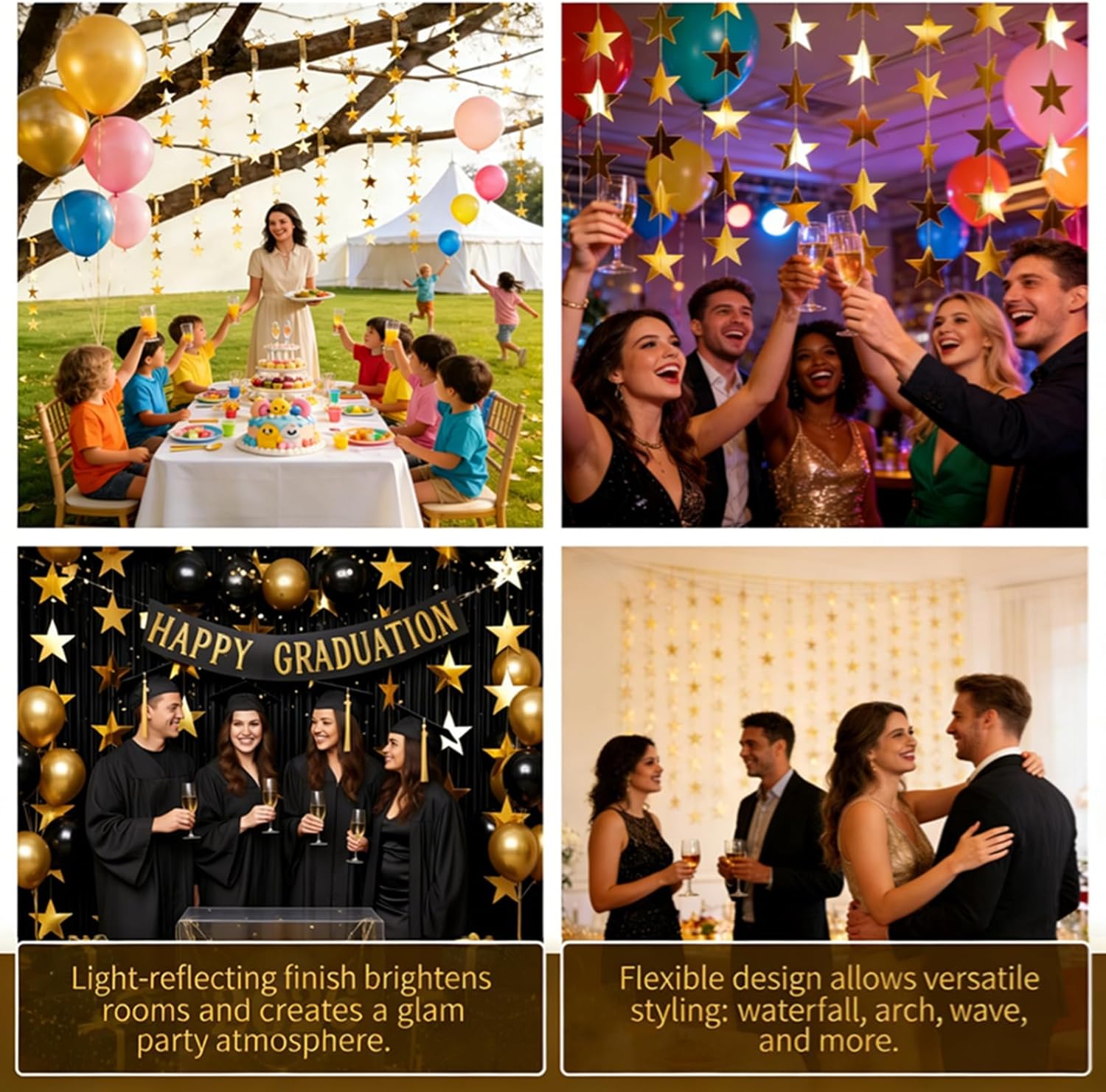 【Reusable & Sturdy: Shiny Mirror Cardstock + Reinforced Sewing】 This gold party decoration is designed for repeated use. Crafted from premium gold mirror cardstock with a double-sided design, it shines bright from every angle under lights and natural sunlight for an eye-catching look that stands out. Stars are securely sewn to the string so they won't fall off, and the sturdy material is easy to store. Reuse it for graduation decorations, Valentine's Day, baby showers and future events—far more cost-effective than disposable decor.