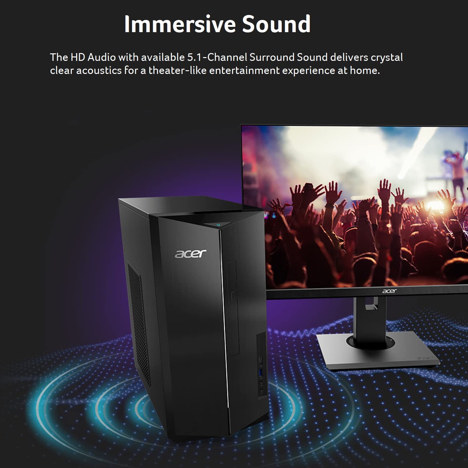 Acer Aspire TC-1760-UA92 Desktop PC comes with these specs: 12th Generation Intel Core i5-12400 6-Core Processor 2.5GHz with Performance-Core Max Turbo Frequency of up to 4.4GHz (18MB SmartCache), Windows 11 Home, 12GB DDR4 3200MHz RAM Memory, Intel UHD Graphics 730, 8x DVD Writer Double Layer Drive (DVD-RW), 512GB M.2 2280 NVMe SSD, High Def Audio with 5.1-Channel Surround Sound Support, 1 - USB 3.2 Type C Gen 1 port (up to 5 Gbps) (Front), 2 - USB 3.2 Gen 1 Ports (1 Front and 1 Rear), 4 - USB 2.0 Ports (Rear), 2 - HDMI Ports (Rear), Intel Wireless Wi-Fi 6 AX201 802.11ax Dual-Band 2.4GHz and 5GHz featuring 2x2 MU-MIMO technology, 10/100/1000 Gigabit Ethernet LAN (RJ 45 port), Bluetooth 5.2, 300W Power Supply, USB Keyboard and Mouse, 17.2 lbs. | 7.8 kg (system unit only), 1 Year Parts and Labor Limited Warranty with Toll Free Tech Support (DT.BHZAA.001)
