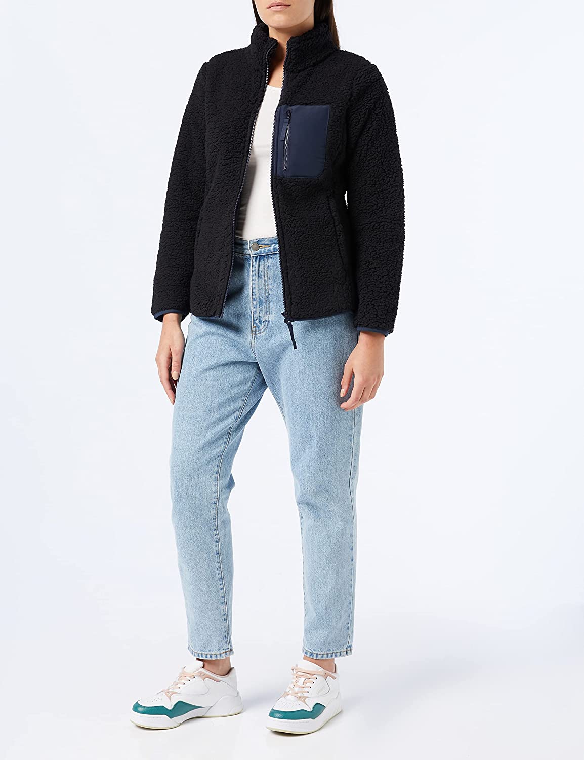 Amazon Essentials Women's Sherpa Long-Sleeve Mock Neck Full-Zip Jacket with Woven Trim