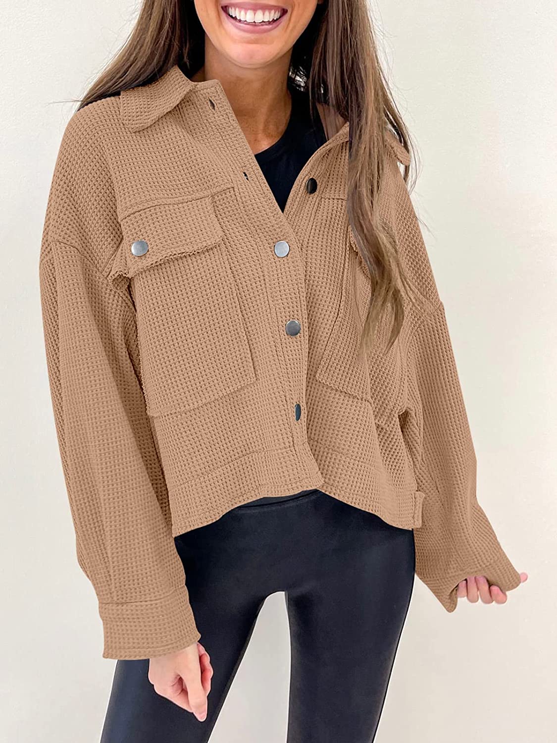ANRABESS Women Waffle Knit Cropped Shacket Shirt Long Sleeve Collared Button Down Pockets Thermal Jacket Coat