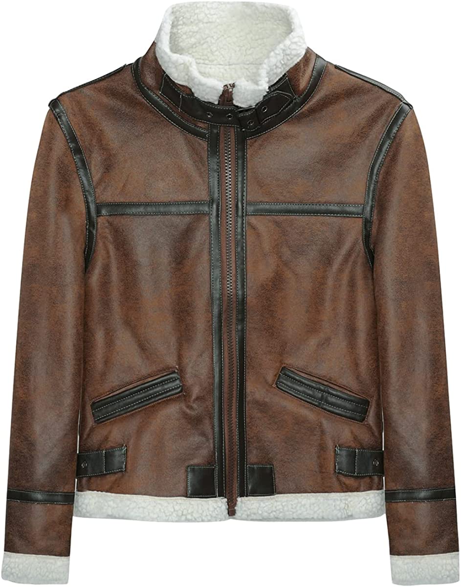 AOWOFS Men's Faux Leather Jacket Brown Motorcycle Bomber Shearling Suede Stand Collar