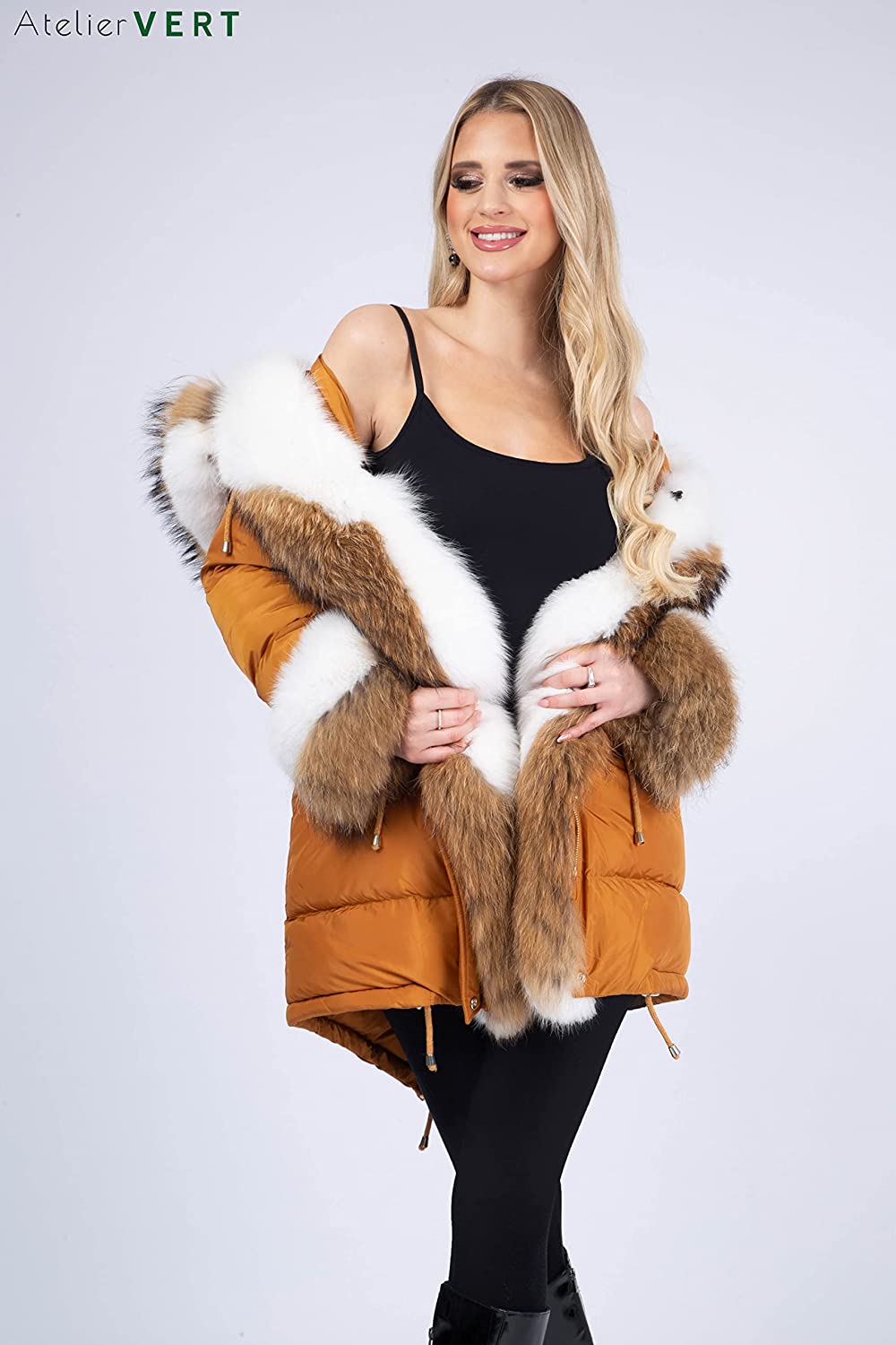 AtelierVert, Women's Inflatable Fox Raccoon Fur Detailed Parka, Women's Fox Fur Parka, Stylish and Luxury Design ATV-105