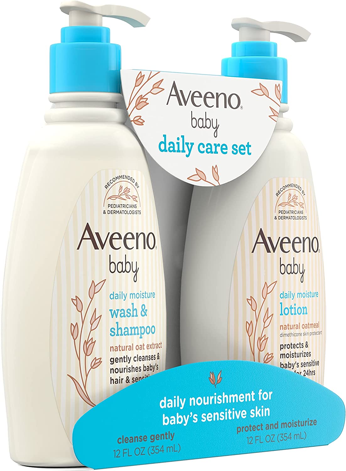 Aveeno Baby Daily Care Gift Set features a gentle 2-in-1 cleansing baby wash & shampoo and a daily moisturizing baby body lotion specially designed for baby's delicate skin. The Aveeno Baby Wash & Shampoo with natural oat extract is a gentle, yet rich lathering bath wash designed for tear-free cleansing of both sensitive skin and hair. The hypoallergenic tear-free formula is pH-balanced and free of soap, sulfates, parabens, phthalates and phenoxyethanol. It rinses clean, leaving a soft, fresh fragrance. After bathing, soothe and moisturize baby's skin with Aveeno Baby Daily Moisture Body Lotion. Containing natural oatmeal blended with dimethicone skin protectant, the fragrance-free lotion formula nourishes and helps protect baby's delicate skin. The non-greasy formula absorbs quickly and moisturizes for a full 24 hours. Plus, the hypoallergenic lotion is free of parabens, phthalates, steroids and phenoxyethanol. Aveeno is a pediatrician and dermatologist recommended brand.
