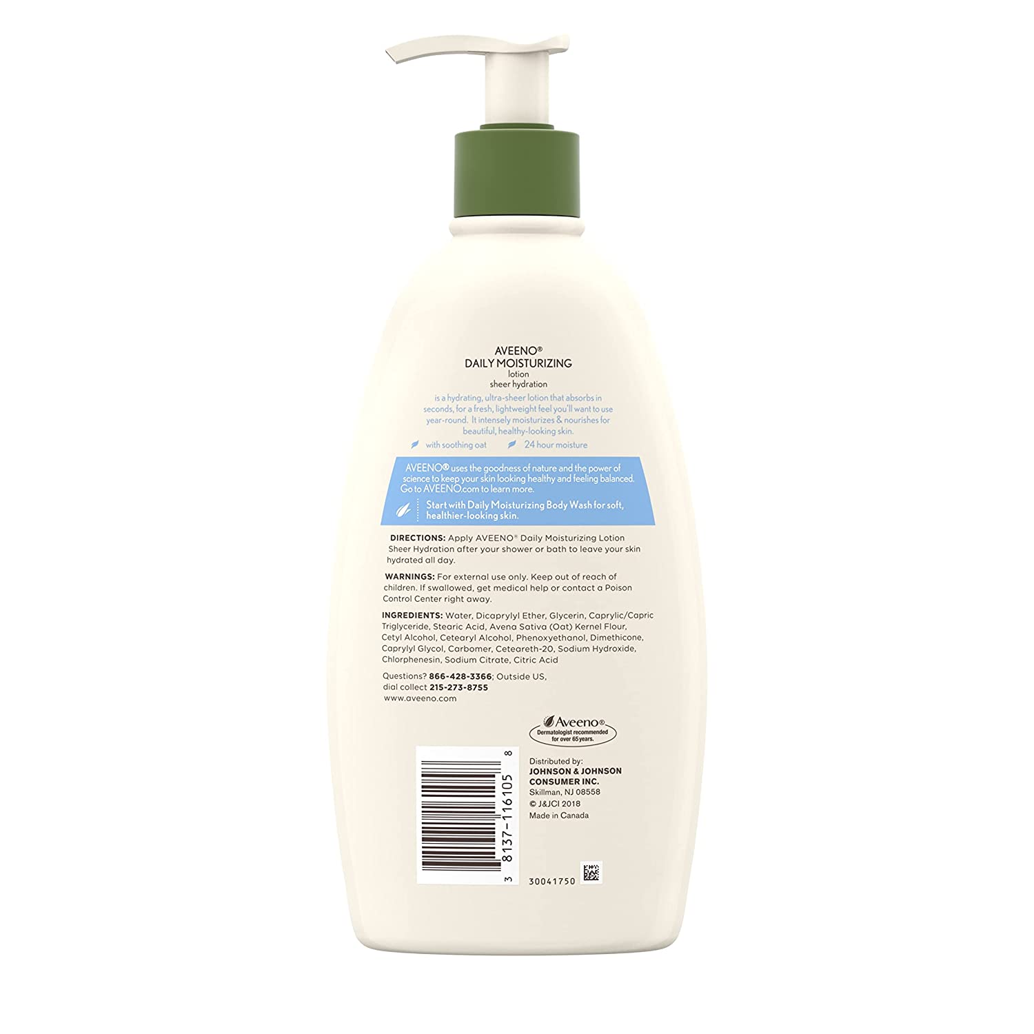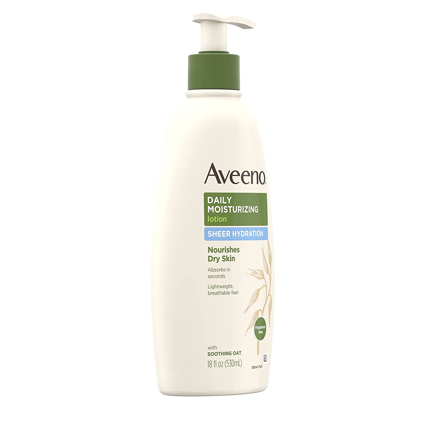 This naturally hydrating, ultra-sheer lotion absorbs in seconds, for a fresh, powdery-light feel you'll want to use year-round. The unique formula with Active Naturals Oat goes on feather-light to replenish and hydrate your skin. Aveeno Daily Moisturizing Lotion Sheer Hydration moisturizes for a full 24 hours, for velvety soft, beautiful, healthy-looking skin. Discover Aveeno Active Naturals. Simply put, Active Naturals ingredients are derived from nature and uniquely formulated to reveal skin's natural health and beauty.