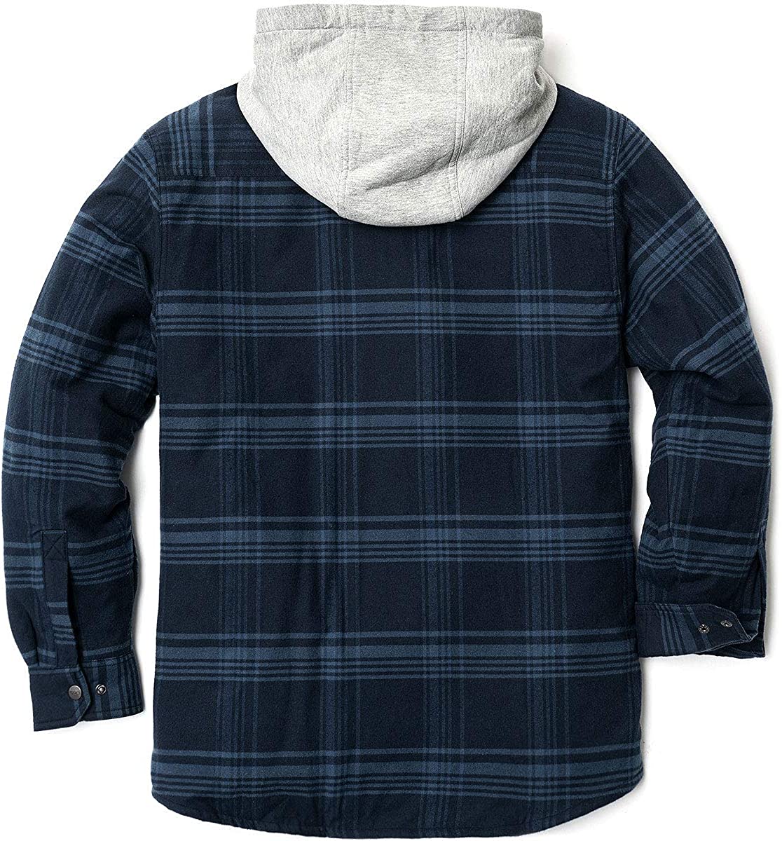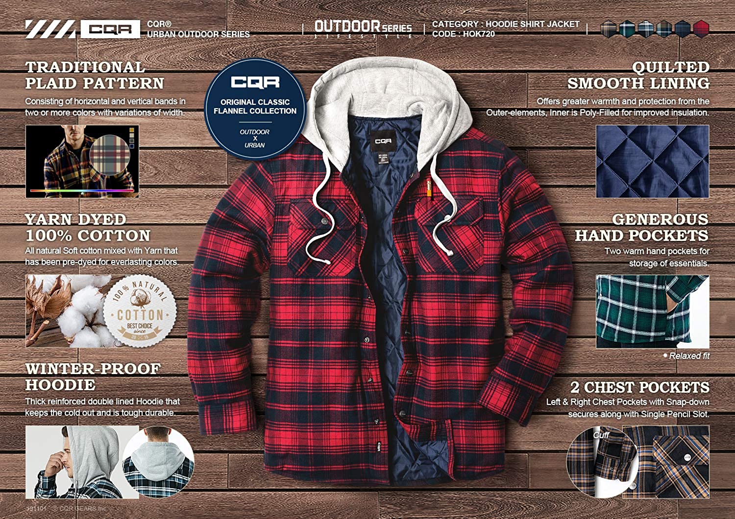 CQR Men's Hooded Quilted Lined Flannel Shirt Jacket, Long Sleeve Plaid Button Up Jackets