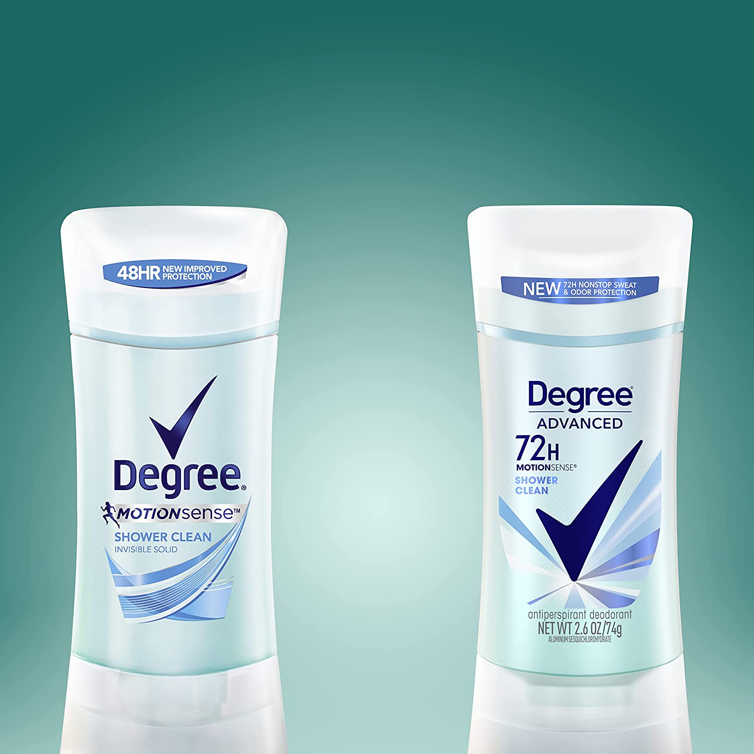 Degree is upgrading to our best formula yet. Our new and improved formulation gives you 72 hours of nonstop sweat and odor protection. You will still find all the same fragrances you know and love, but now with our new and improved long lasting protection! For a limited time, you may still receive our old 48-hour formulation while all our new 72-hour products make their way to a store near you. Degree Advanced Shower Clean Antiperspirant Deodorant delivers nonstop protection, so you can face the day with confidence. This antiperspirant for women features 72-hour sweat and odor protection and the bright floral scent of rose and jasmine, blended with delicate fruit for an invigorating, clean feeling. Only Degree has MotionSense technology that moves in sync with your body. This antiperspirant deodorant spray releases a burst of subtle fragrance every time you move, for nonstop protection. Degree Advanced Shower Clean Antiperspirant Deodorant keeps you feeling fresher, drier, and more confident. This powerful antiperspirant deodorant responds when you need it most so that you don't have to worry about slowing down. Simply swipe and start moving.