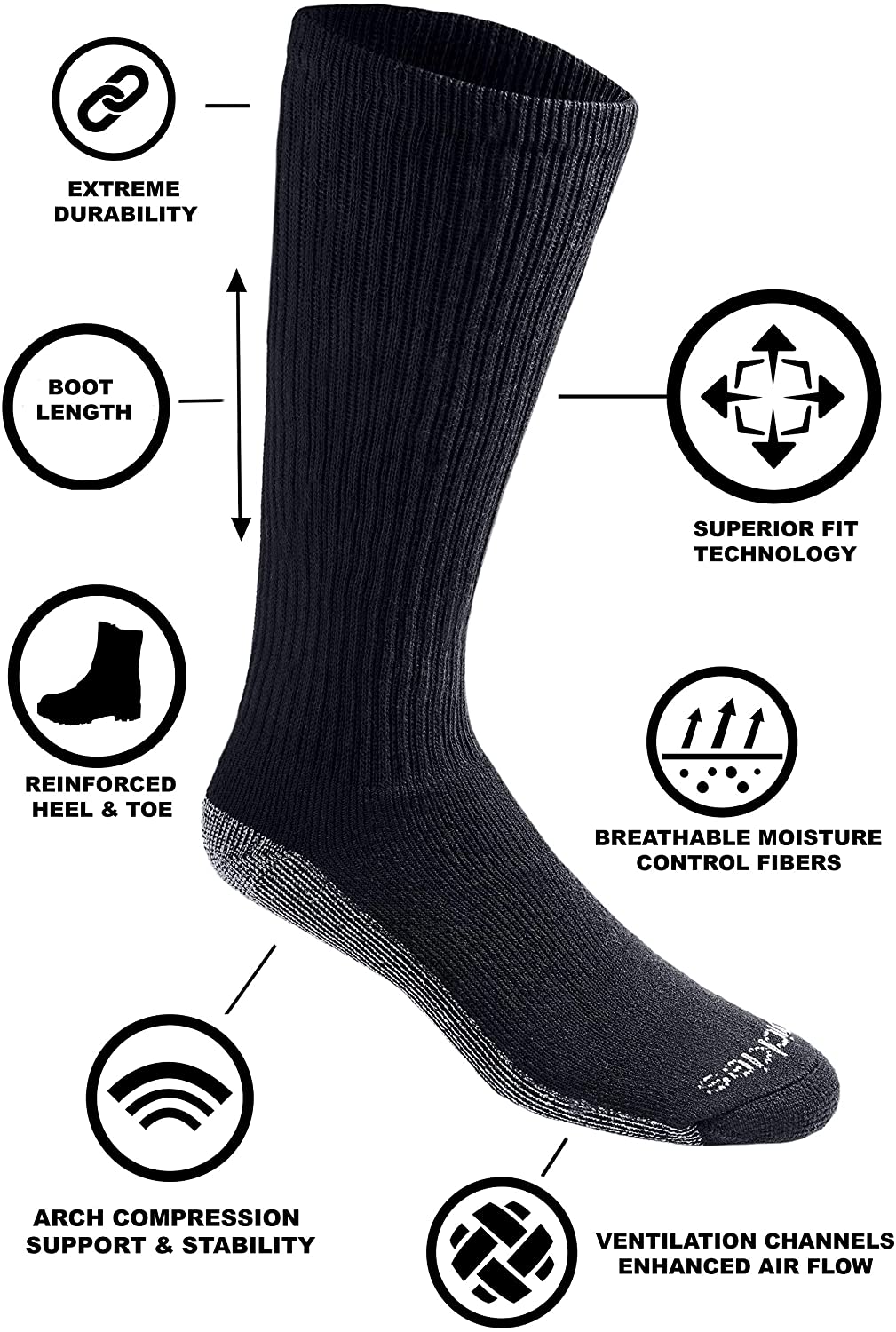 Dickies Dri-tech comfort 6 Pairs best work boot length socks with wicking, moisture management fibers keeps feet dry, ventilation channels engineered for air circulation and moisture control, arch compression hugs feet and keeps socks in place, while providing in-step support, Reciprocated heel and toe for superior fit and full cushion comfort.
