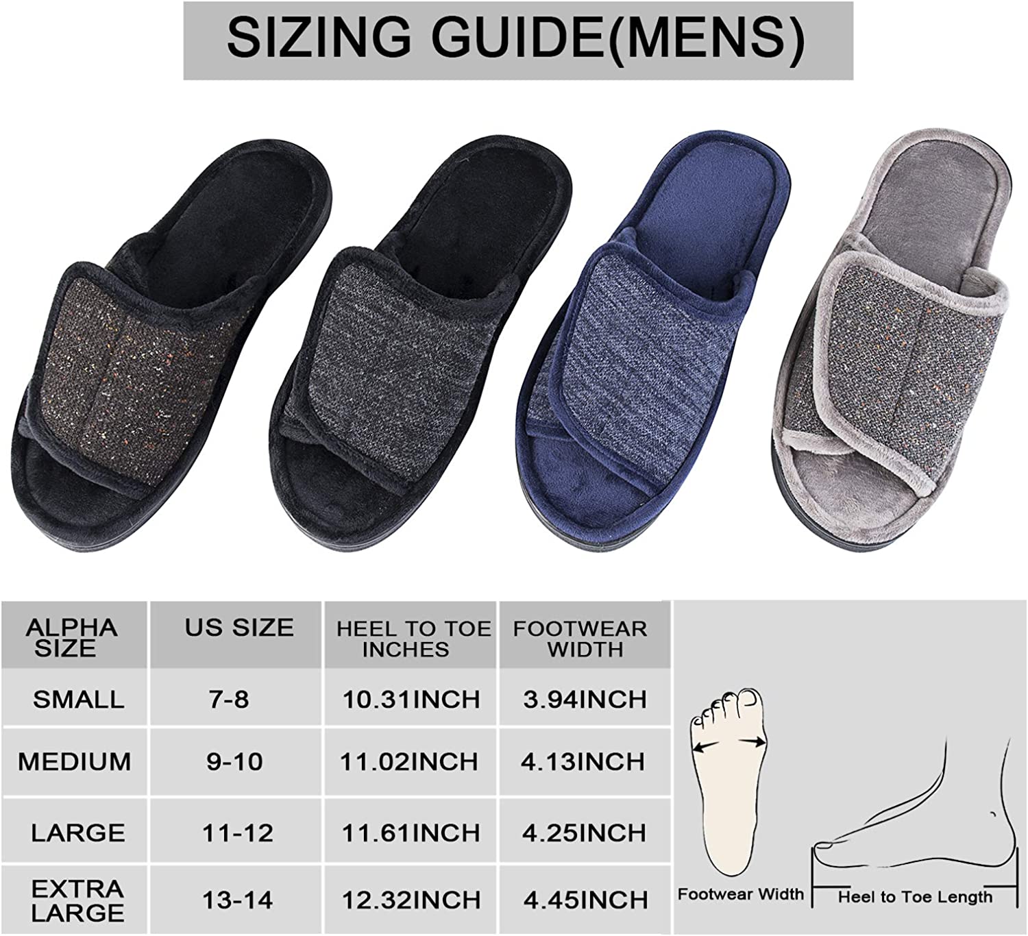 DL Adjustable Mens Slippers Memory Foam, Open Toe House Slippers for Men Comfy Indoor Outdoor, Cozy Breathable Slide Bedroom Velcor Slippers Size 7-14 Black Gray Navy Brown