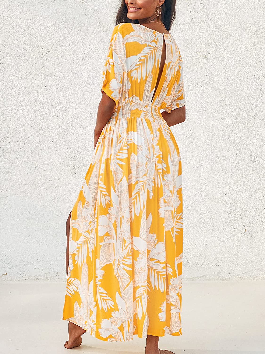 Dress for Women Summer Midi Dress V Neck Button Elastic Waist Cut Out Back 3/4 Sleeves Floral Printed