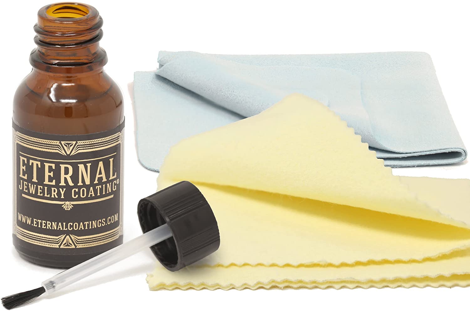 Eternal Jewelry Coating is the most durable and easy-to-use, affordable jewelry coating ever created. Our proprietary formula utilizes nano-ceramic technology to achieve maximum durability while maintaining the beauty and feel of metal and stone jewelry. In addition, a Polishing Cloth and Suede Microfiber are included in the kit for cleaning and maintaining your jewelry. Eternal Jewelry Coating is also the perfect way to protect the delicate details and quality of hand-stamped, oxidized with Liver of Sulfur, Patina, Gold Plating, Costume and Boho jewelry. Unlike other coatings that act similar to a clear paint, Eternal Jewelry Coating bonds with the surface of your jewelry at a molecular level, allowing the coating to protect more effectively, require less thickness and never separate or peel. The ease of applying Eternal Jewelry Coating is one of it’s greatest benefits. Other coatings require drying time during which the coating will be ruined if it is touched, uneven, too thick or encounters a spec of dust. It’s impossible to get it right every time no matter how careful and skilled you are. Eternal Jewelry Coating eliminates these application issues. Once the coating is applied with the included brush cap, the nanoparticles bond to the surface of your jewelry. After 5 minutes, you simply polish off the remaining coating with the included suede microfiber and you’re finished! The coating will create a water and dust repellent surface that’s easy-to-clean, prevents allergic reactions and protects the piece from tarnish and wear. Additional layers and future maintenance coats can be easily applied with the same process.
