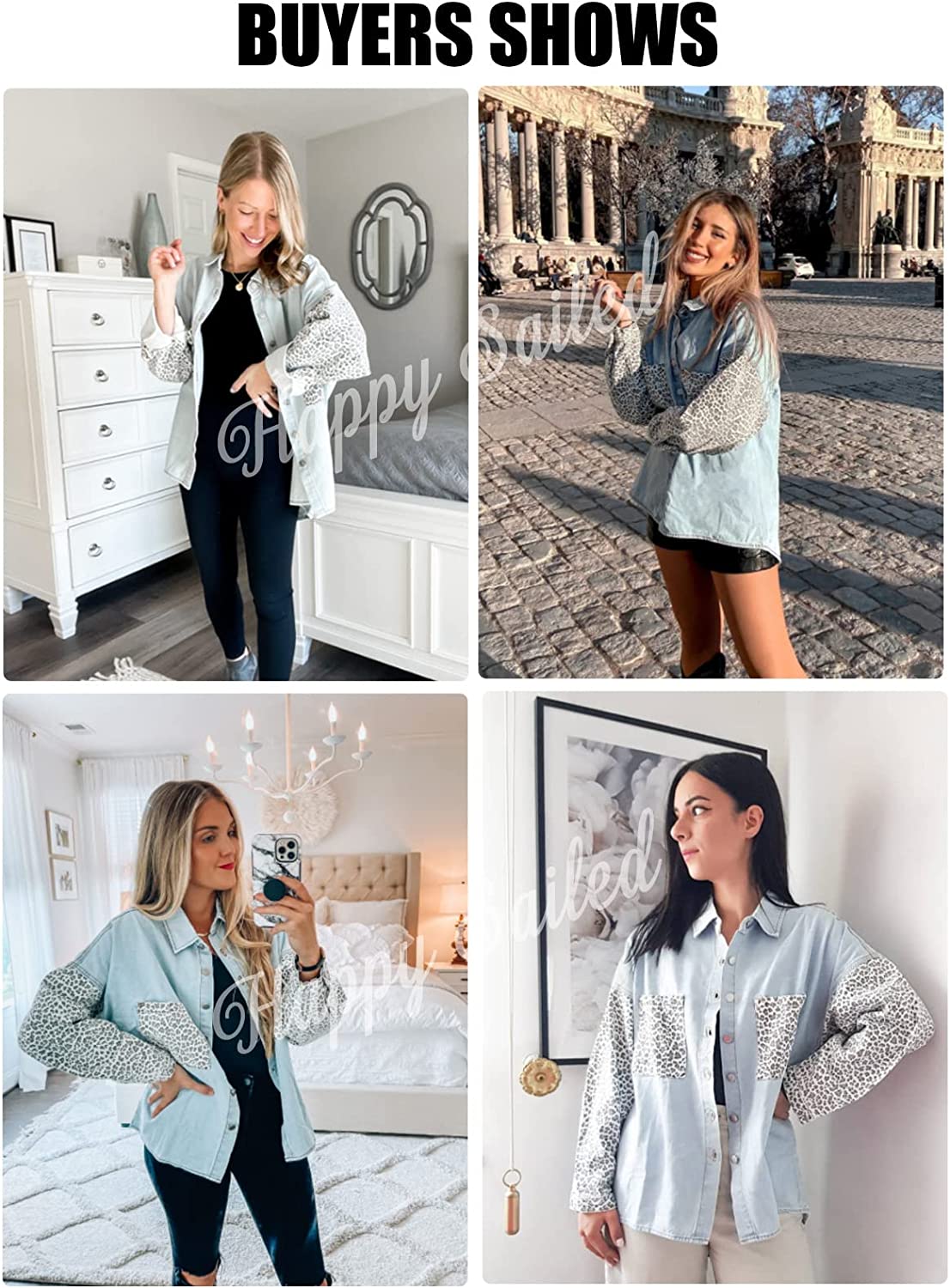 Happy Sailed Womens Leopard Contrast Denim Jackets Oversized Long Sleeve Button Down Jean Shacket Jacket S-2XL