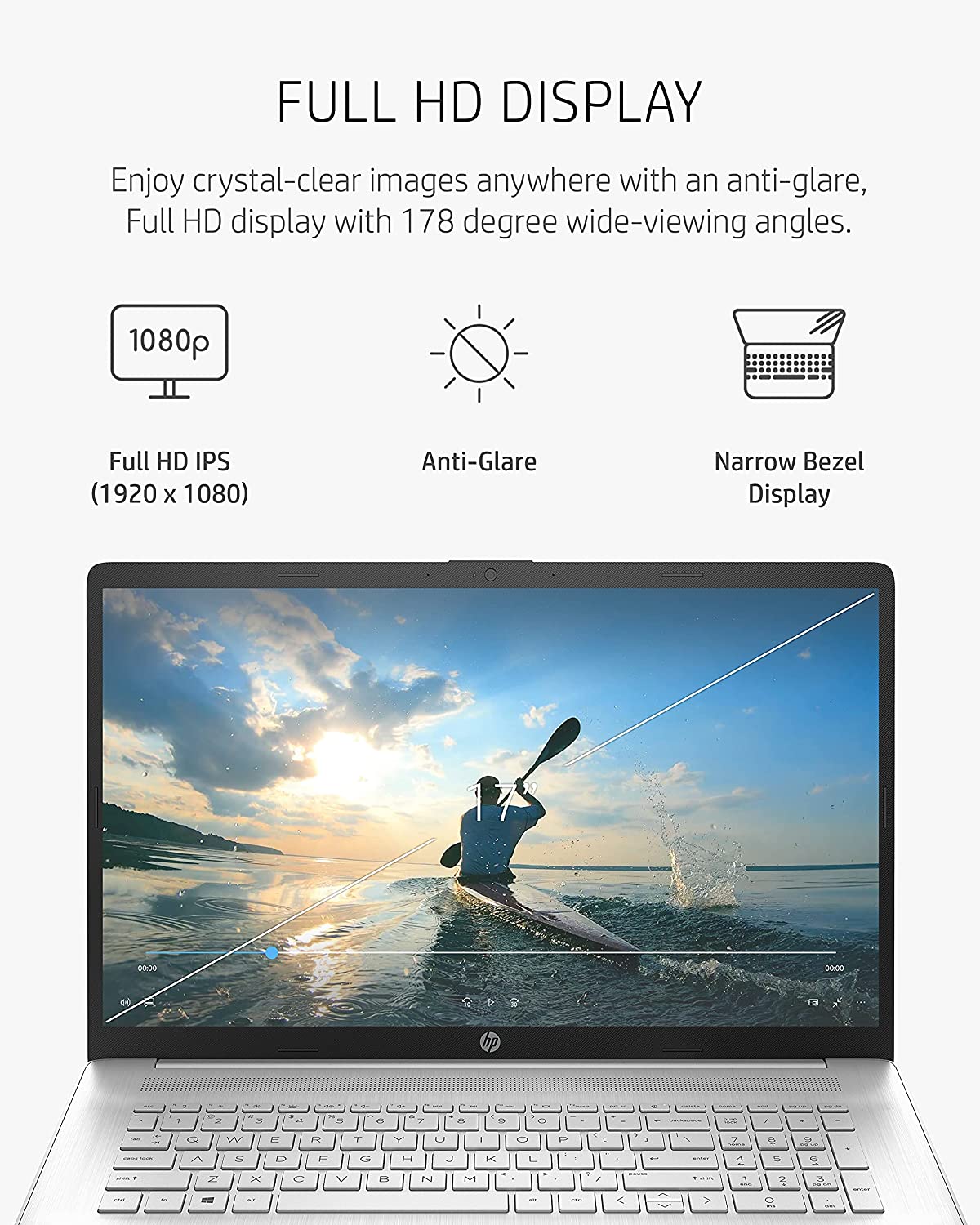 Thoughtfully crafted, the HP 17 Laptop PC blends sustainability with performance and comfort. Computing has never been more satisfying or comfortable with the lift-hinge design and enlarged click pad. It's not just the keyboard that’s comfortable but the display too; the 178 degree wide-viewing angles and the anti-glare screen make every visual experience a memorable one on a FHD IPS display (1). Enjoy reliable performance and incredible graphics thanks to the perfect combination of the 11th Generation Intel® Core™ i5-1135G7 processor and Intel® Iris® Xe Graphics (2) (3). Get all the storage you need and the high bandwidth you crave courtesy of your laptop computer’s 512 GB of Solid-State Drive storage and 8 GB of RAM (4) (5). Beyond the hardware, this HP laptop has many more features to take your work and play to new levels of comfort. Don’t stress about battery life again with up to 8 hours and 15 minutes to play with (6), plus the added benefit of HP Fast Charge technology for quicker recharges when you need it (7). Get right to work with the Windows 10 operating system you know and love and enjoy a greater peace of mind thanks to the HP 1-year limited hardware warranty (8). Your internet is smooth, stable, and supports an ultra-fast gigabit data rate with a Wi-Fi 6 (1x2) and Bluetooth® 5.2 combo (9) (10). Keep up the productivity, even while you work from anywhere. This Windows laptop has everything you need for expert video calls from the HP TrueVision HD camera to the custom-tuned dual speaker setup (11). Additional integrated features like the fingerprint reader and the backlit keyboard ensure your workspace is secure and comfortable, wherever or whenever you work (12). Do your part toward a sustainable future with an environmentally responsible laptop. Eco-conscious materials like ocean-bound plastic are used in the construction of the cover, bezel, and speaker enclosure (13). The outer boxes and fiber cushions used in the packaging are 100% sustainably sourced and recyclable (14). The HP 17.3 laptop is also ENERGY STAR® certified and EPEAT® Silver registered (15) (16). (1) Full High Definition (FHD) content is required to view FHD images. (2) Multi-core is designed to improve the performance of certain software products. Not all customers or software applications will necessarily benefit from the use of this technology. Performance and clock frequency will vary depending on the application workload and your hardware and software configurations. Intel’s numbering, branding, and/or naming is not a measurement of higher performance. Intel, Pentium, Intel Core, Celeron, Iris Xe, Intel logo, and the Intel Inside logo are trademarks of Intel Corporation in the U.S. and other countries. (3) Shared video memory (UMA) uses part of the total system memory for video performance. System memory dedicated to video performance is not available for other use by other programs. (4) Actual formatted capacity is less. A portion of internal storage is reserved for preloaded content. (5) Based on HP internal testing using CrystalDiskMark benchmarking software. Performance is sequentially faster (read-only) compared to traditional 5,400 rpm HDD. (6) Windows 10 MobileMark 18 battery life will vary depending on various factors including product model, configuration, loaded applications, features, use, wireless functionality, and power management settings. The maximum capacity of the battery will naturally decrease with time and usage. See bapco.com/products/mobilemark-2018/ for additional details. (7) Recharges your battery up to 50% within 45 minutes when the system is off (using the “shutdown” command). Recommended for use with the HP adapter provided with the notebook, not recommended with a smaller capacity battery charger. After charging has reached 50% capacity, charging speed will return to normal speed. Charging time may vary +/-10% due to System tolerance. (8) Not all features are available in all editions or versions of Windows. Systems may require upgraded and/or separately purchased hardware, drivers, software, or BIOS update to take full advantage of Windows functionality. Windows 10 is automatically updated, which is always enabled. ISP fees may apply and additional requirements may apply over time for updates. See microsoft.com (9) Wireless access point and internet service required and sold separately. Availability of public wireless access points limited. Requires a wireless router, sold separately, that supports 80MHz channels. Wi-Fi 6 (802.11ax) is backwards compatible with prior 802.11 specs. The specifications for Wi-Fi 6 are draft and are not final. If the final specifications differ from the draft specifications, it may affect the ability of the notebook to communicate with other Wi-Fi 6 devices. Only available in countries where 802.11ax is supported. Based on Wi-Fi 5 80MHz and Wi-Fi 6 160MHz minimum requirements when transferring files between two devices connected to the same router. Requires a wireless router, sold separately, that supports 802.11ax (Wi-Fi 6). Only available in countries where 802.11ax is supported. (10) Bluetooth® is a trademark owned by its proprietor and used by Hewlett-Packard Company under license. (11) Features may require software or other 3rd party applications to provide the described functionality. Internet service required and not included. (12) Wireless access point and internet service required and sold separately. Availability of public wireless access points limited. (13) Percentage of ocean-bound plastic contained in each component varies by product. (14) 100% outer box/corrugated cushion packaging made from sustainably sourced certified and recycled fibers. Fiber cushions are made from 100% recycled wood fiber and organic material. Excludes plastic bags and plastic foam sheeting. (15) ENERGY STAR and the ENERGY STAR mark are registered trademarks owned by the U.S. Environmental Protection Agency. (16) Based on U.S. EPEAT