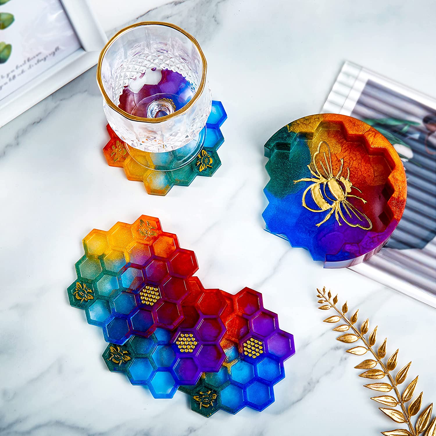 ISSEVE Honeycomb Coaster Resin Molds Set, 4Pcs Coaster Silicone Molds for Epoxy Resin with Storage Box Mold, Coaster Molds for Resin Casting, Epoxy Mold for DIY Resin Crafts, Cup Mats, Home Decoration