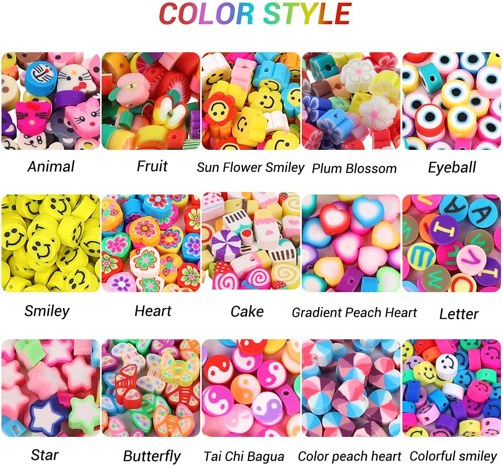 JOICEE 300PCS Fruit Smiley Handmade Polymer Clay Beads 15 Styles Flower Letter Beads Soft Beads for Women Girls Jewelry Making DIY Bracelet Necklace Earring Accessories with 4m Crystal Elastic String.