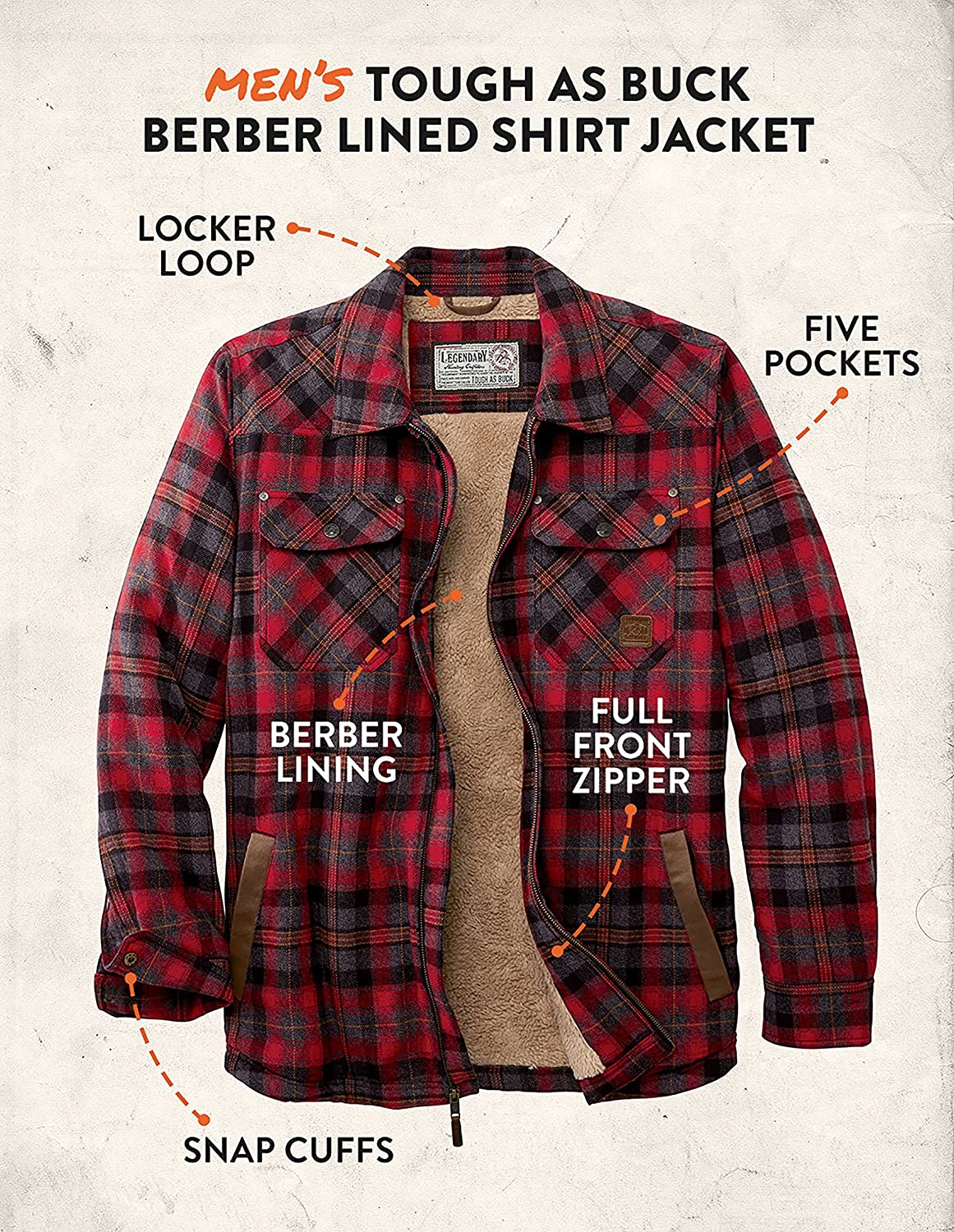 Legendary Whitetails Men's Tough as Buck Berber Lined Flannel Shirt Jacket