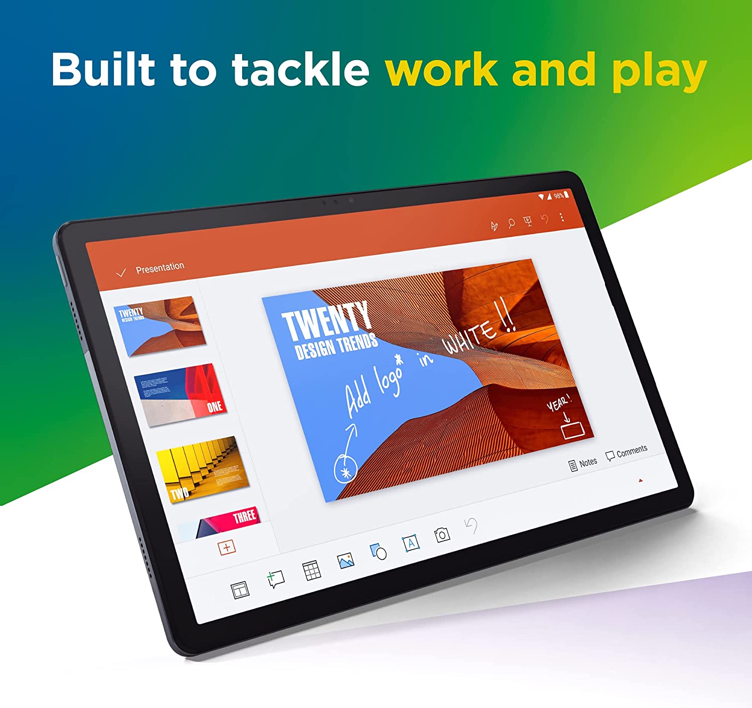 Experience first-class multimedia and fun with the Lenovo Tab P11 Plus with an included keyboard. This Android tablet features a large, 11-inch screen with 2K resolution. You'll enjoy beautiful video in the IPS LCD touch display and great audio through quad speakers with user-facing stereo tuned by Dolby Atmos®. Inside, you'll find a powerful octa-core chip, 6GB + 128GB memory. Plus, this slim and lightweight tablet delivers epic battery life in an aluminum-alloy design with a dual-tone finish available in an elegant slate grey color.