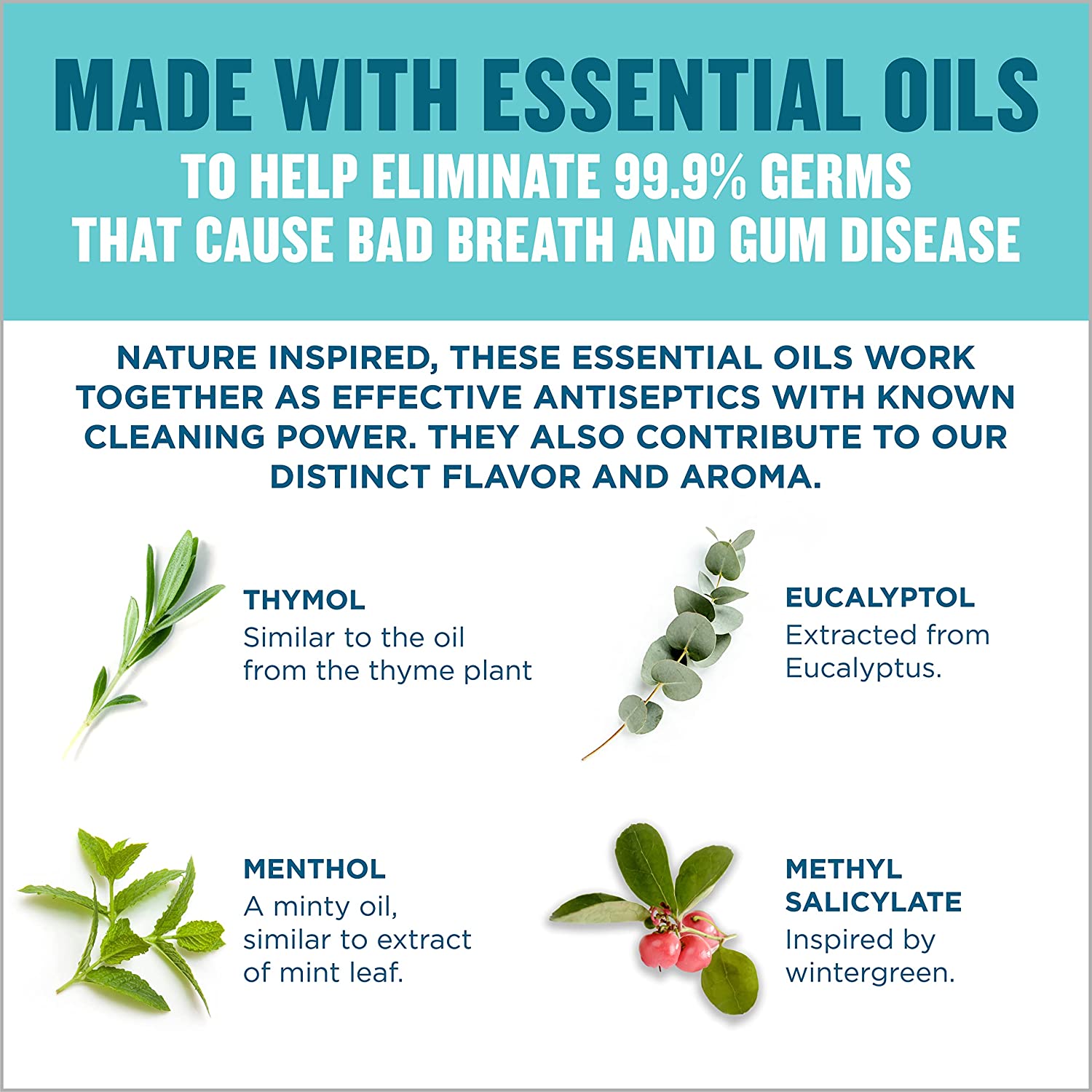 Protect your mouth from germs and get fresh breath with Listerine Cool Mint Antiseptic Mouthwash. It kills 99.9% of germs that cause bad breath, plaque and gingivitis, for a fresher and cleaner mouth than brushing alone. Accepted by the American Dental Association, this germ-killing mouthwash for bad breath is clinically shown to reduce plaque 52% more and reduce gingivitis 21% more than brushing and flossing alone. Adding a 30-second rinse to your morning and evening routines is all it takes to get 24-hour germ protection and achieve maximum results. Listerine Cool Mint Antiseptic Mouthwash leaves your mouth feeling intensely clean.