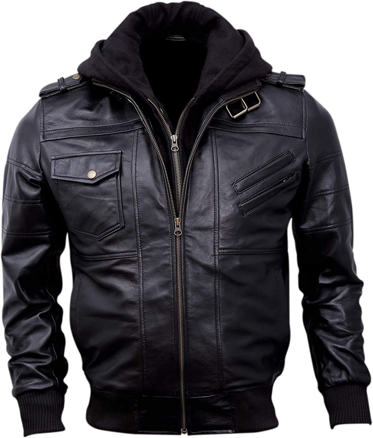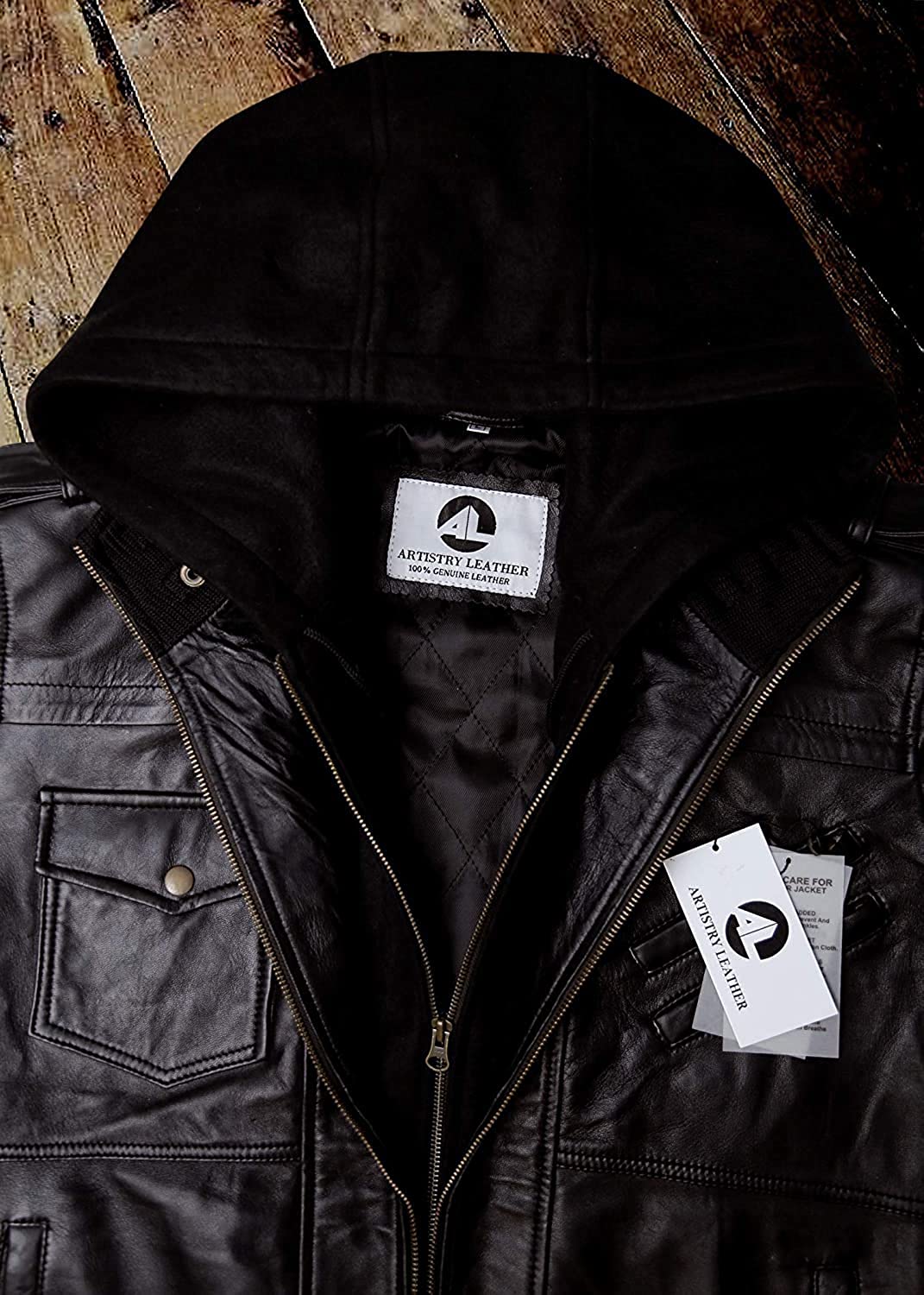 Mens Genuine Black Hooded Bomber Leather Jacket | Real Lambskin Waxed Brown Leather Jackets for Men with Removable Hood